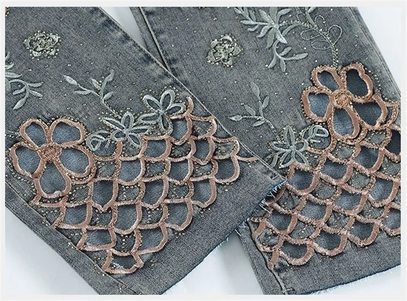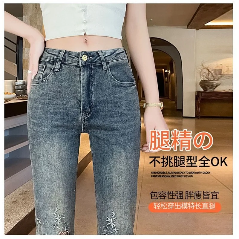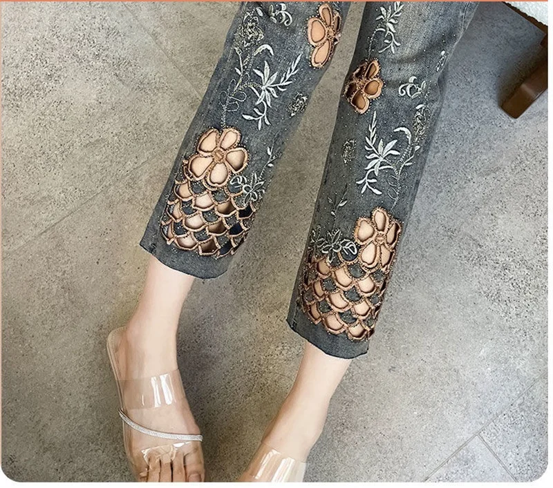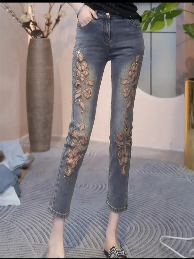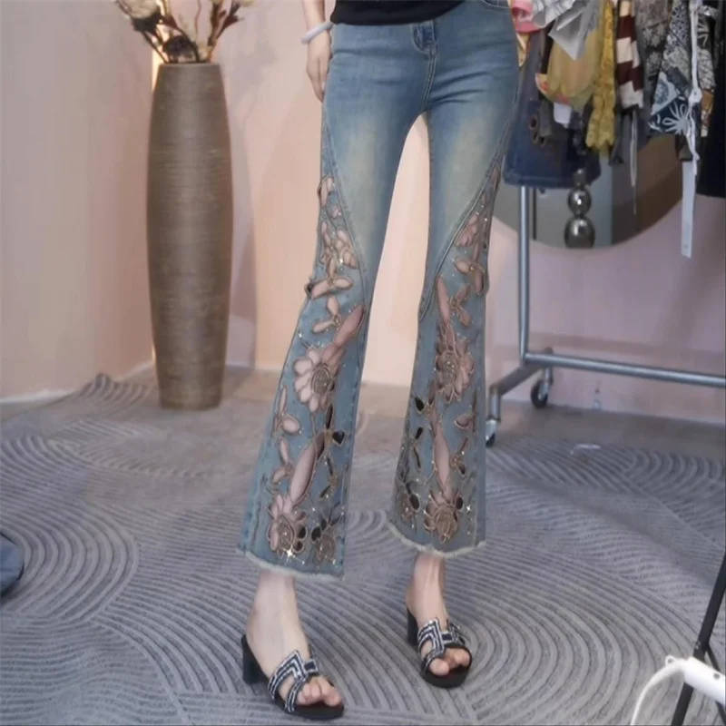 2025 Summer New Fashion Hollow Embroidered Jeans For Women Heavy Industry High Waist Slim Ankle-Length Pants Ladies Denim Pants