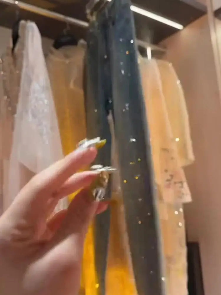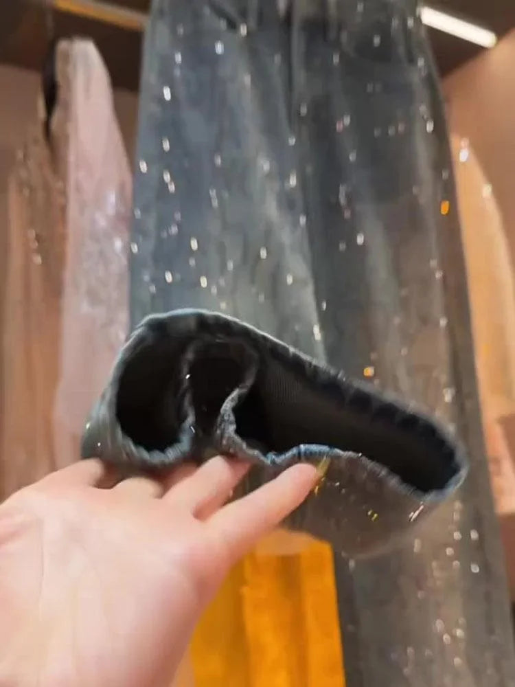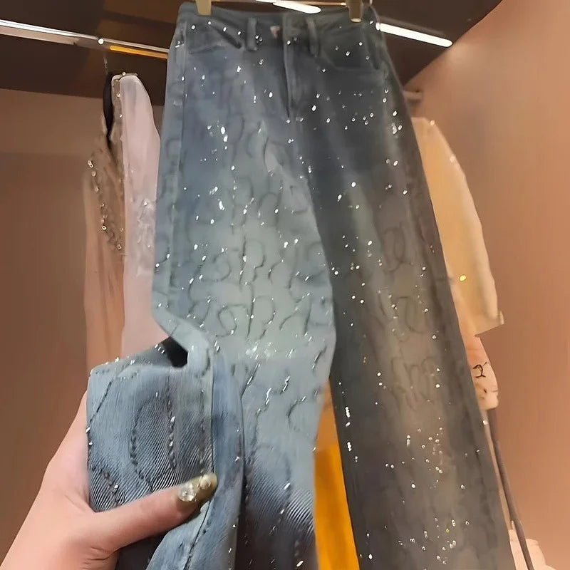 Blue Heavy Embellied Design Women's Jeans Loose Fit Straight Leg Wide Leg Pants Versatile Slimming Spring Summer New Arrival