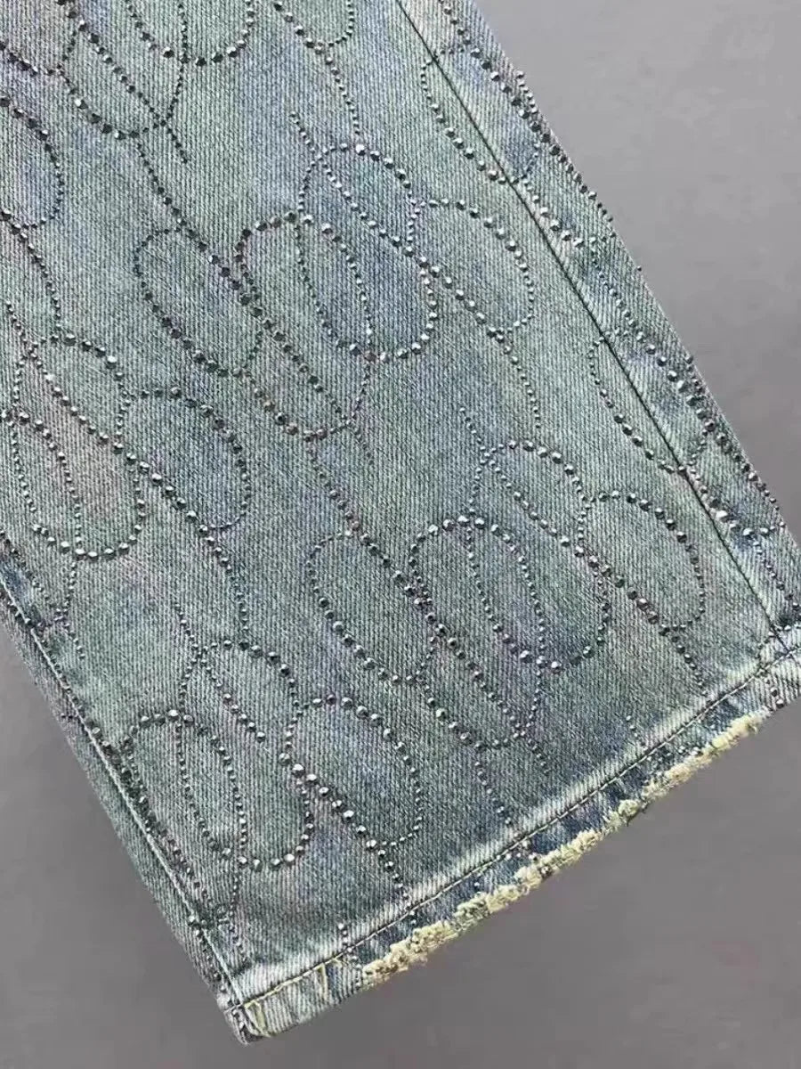 Featuring a unique heavy rhinestone embellishment, these jeans add a touch of glamour to any outfit.