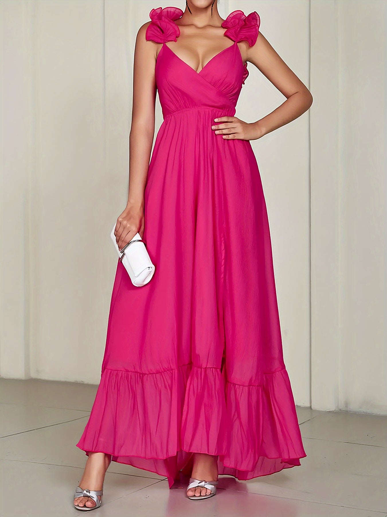 Contrast Mesh V Neck Wedding Dress, Elegant Sleeveless Split Ruffle Hem Dress For Party & Banquet, Women's Clothing