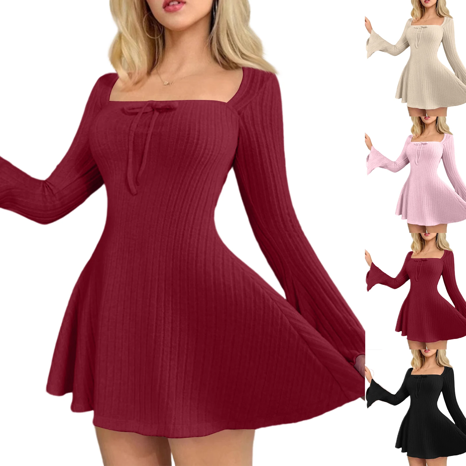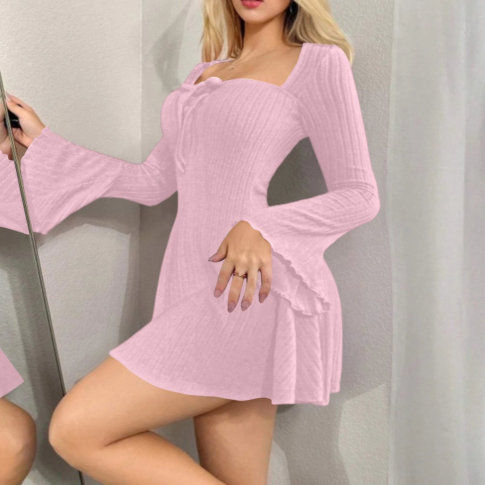 Dresses Women Blush Ribbed Bell-Sleeve Mini Dress Casual Date Party Street Daily 2026 Trendy Solid Multi Color Nuevo Estilo