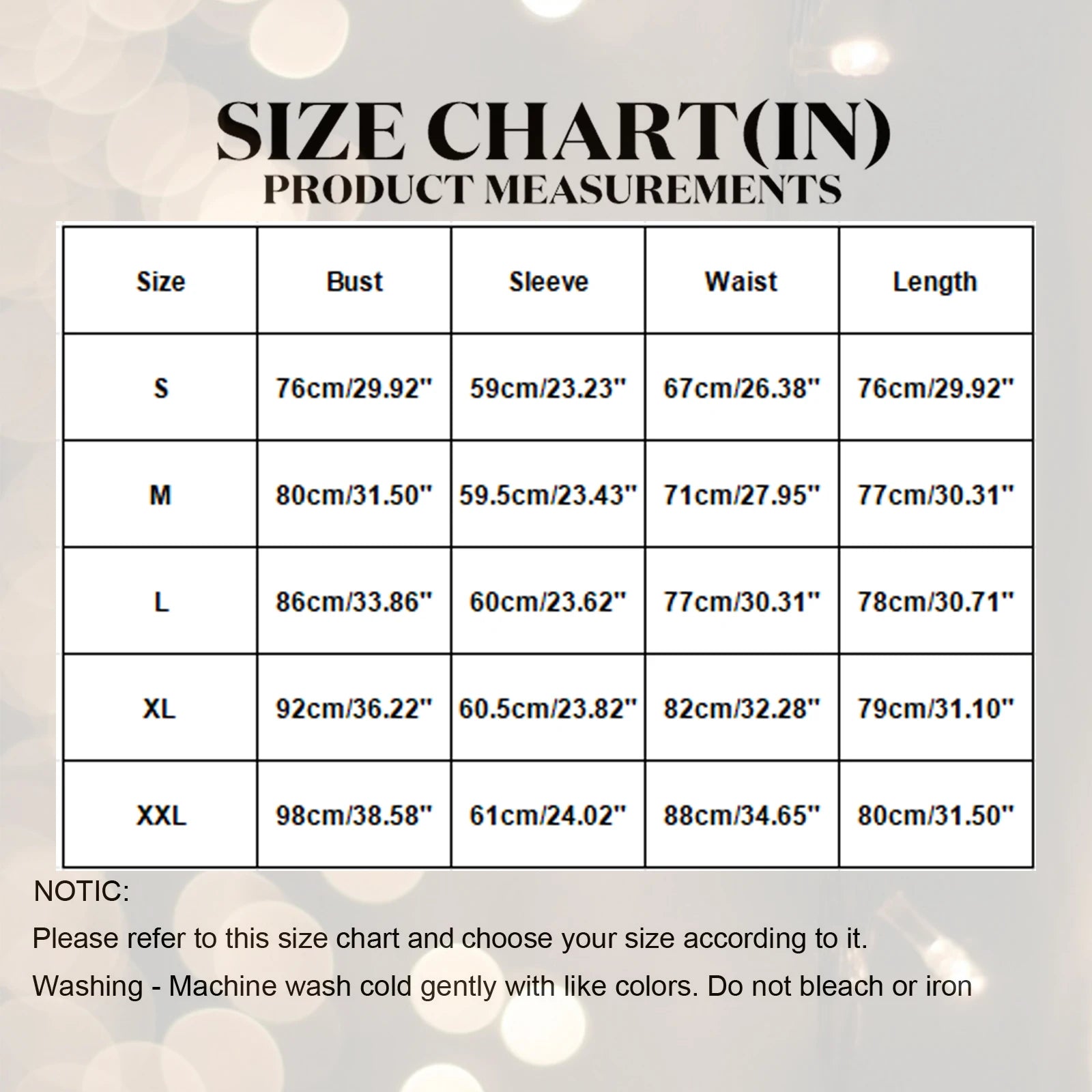 | Size | Bust | Sleeve | Waist | Length |