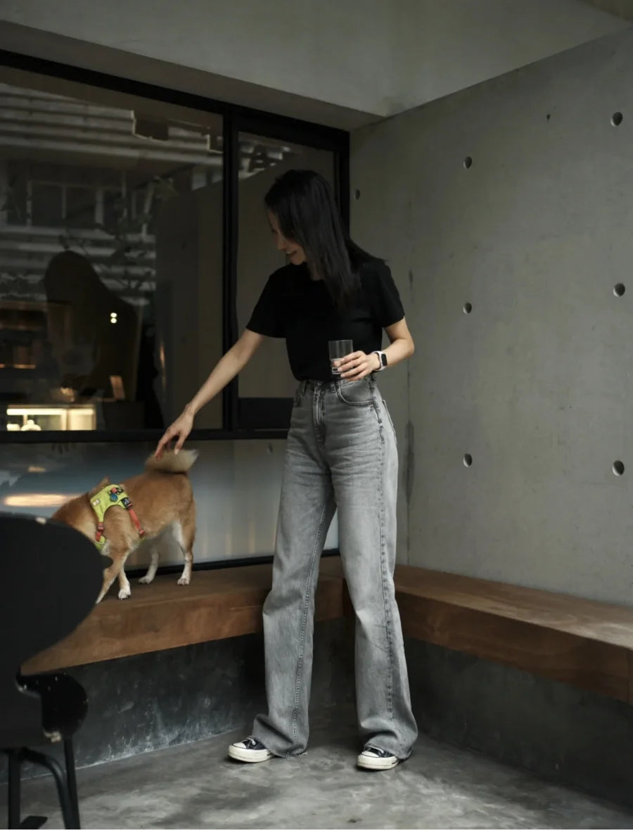 ETJ Wide-leg high-waisted jeans women's classic everything with five pockets washed soft comfortable ultra-long jeans6045022