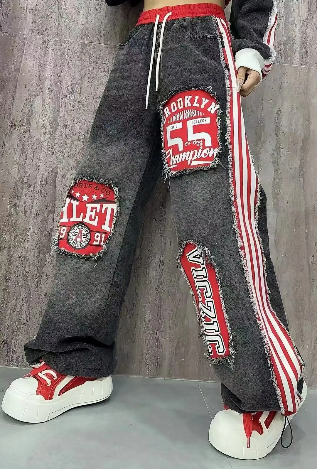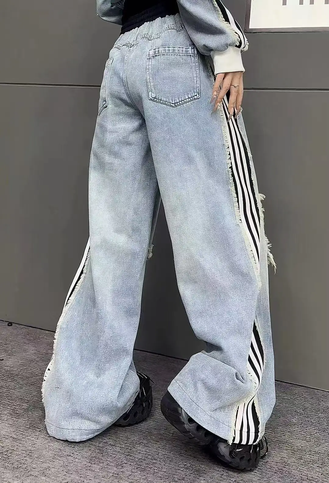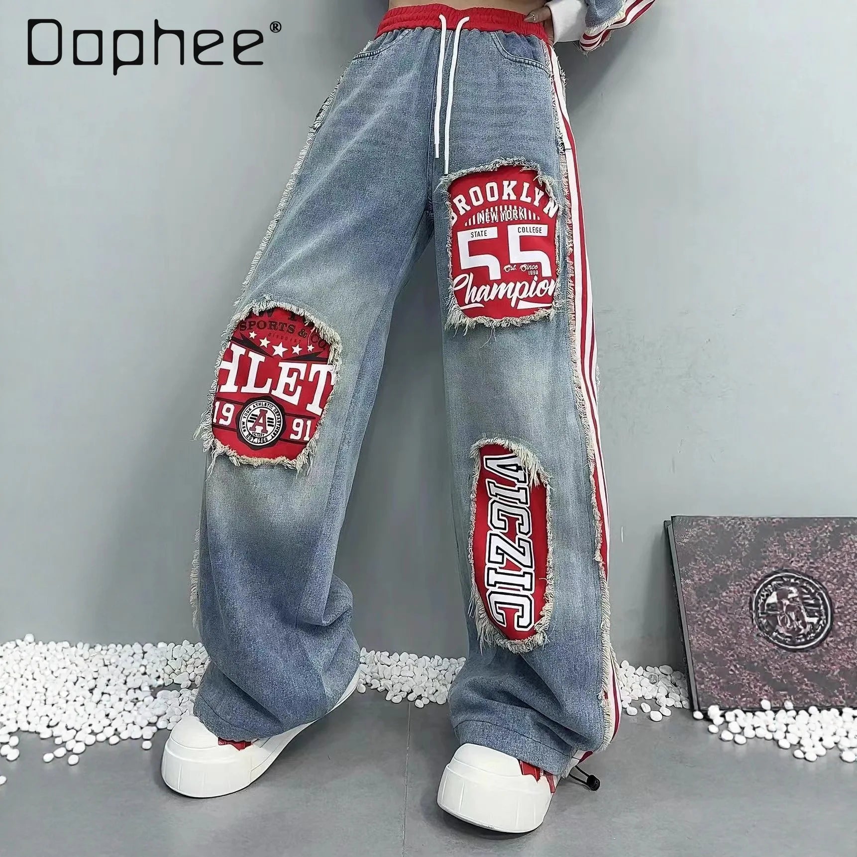 European Style Women's Jeans 2025 Autumn New Heavy-Duty Distressed Frayed Edge Letter Print Drawstring Long Pants Jeans Woman