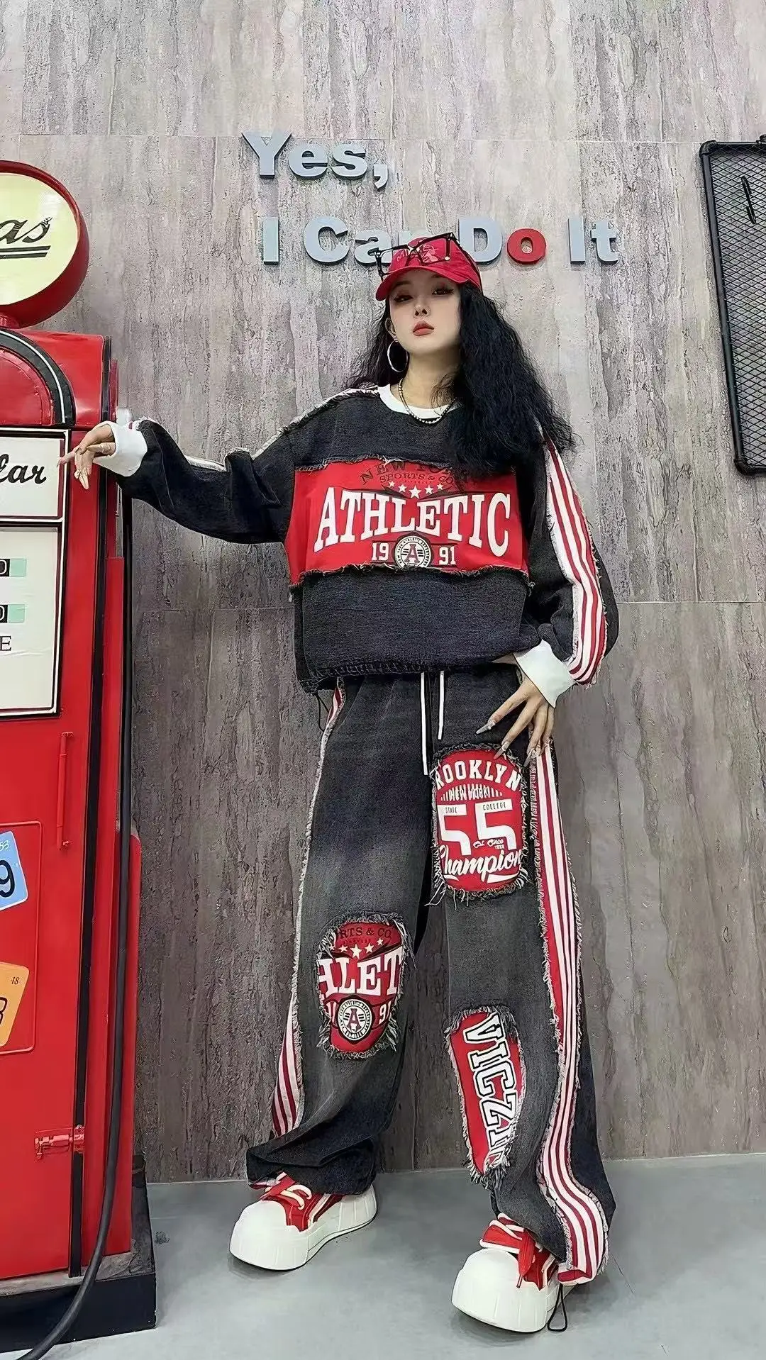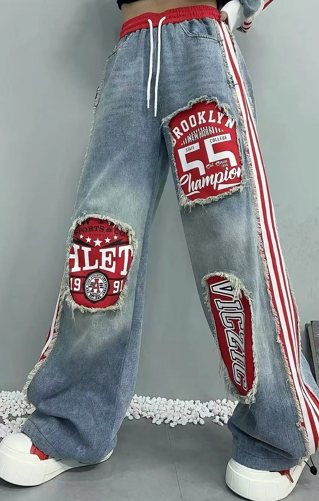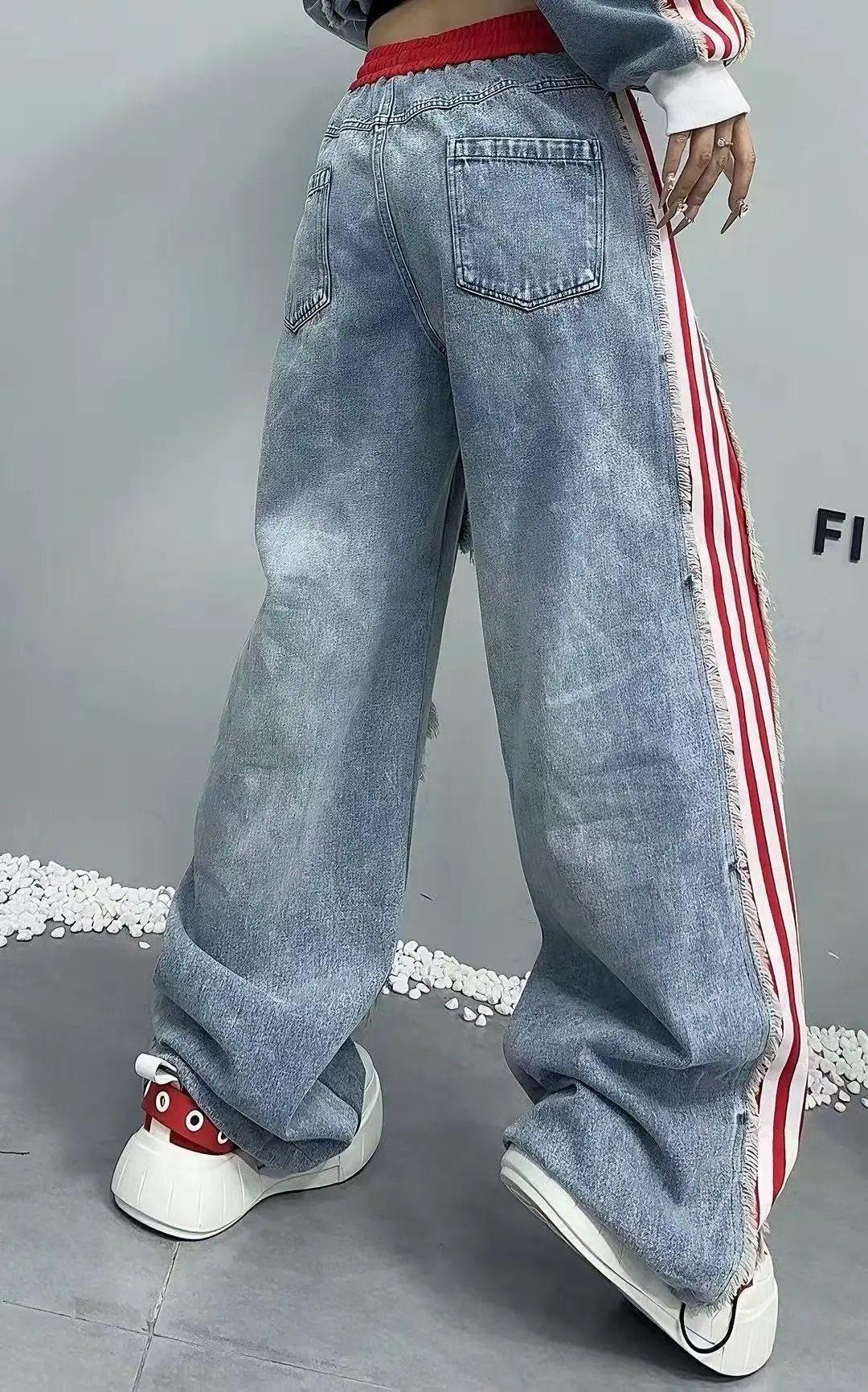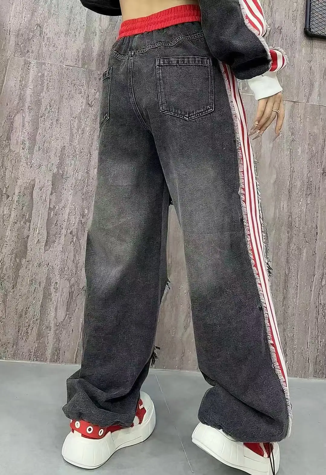 European Style Women's Jeans 2025 Autumn New Heavy-Duty Distressed Frayed Edge Letter Print Drawstring Long Pants Jeans Woman