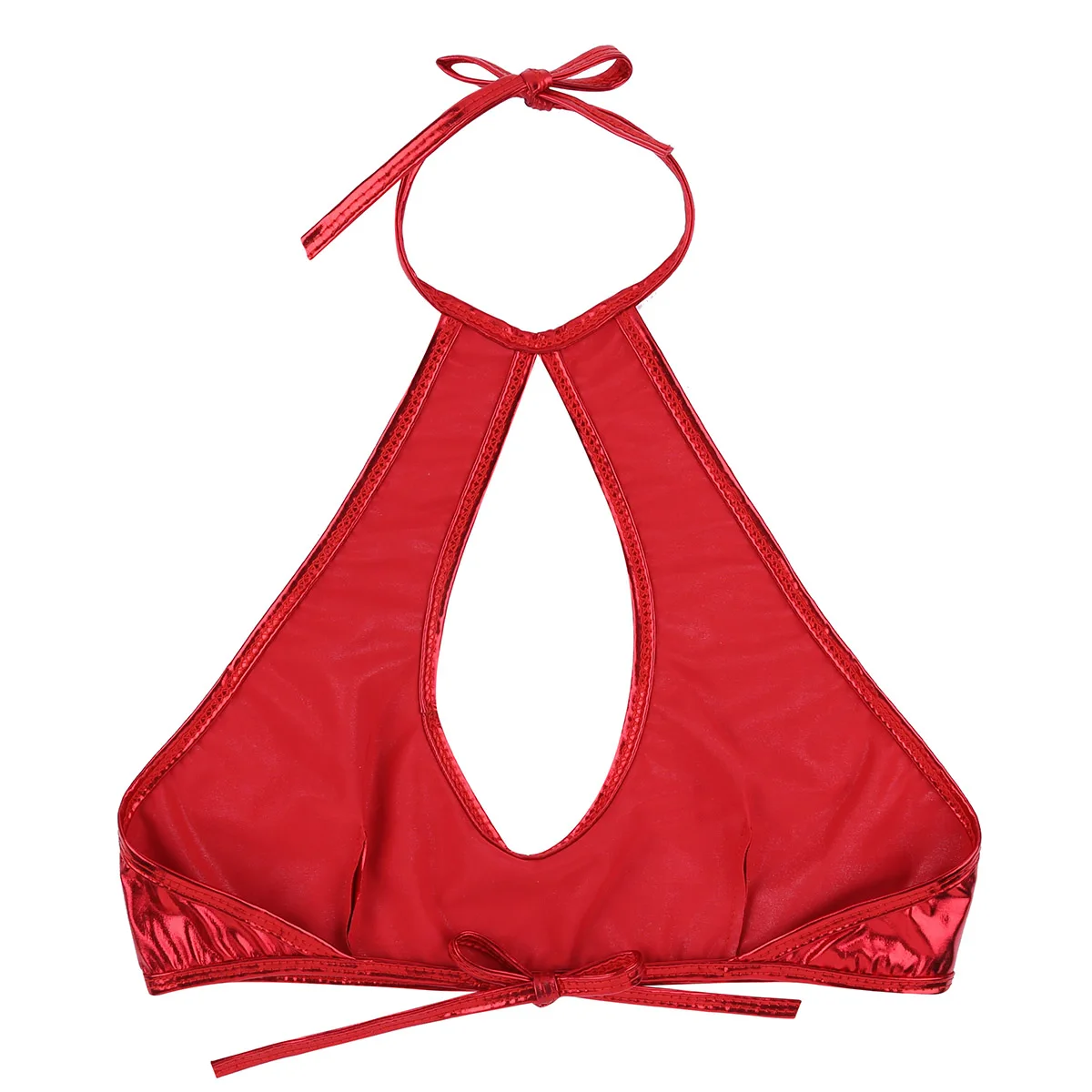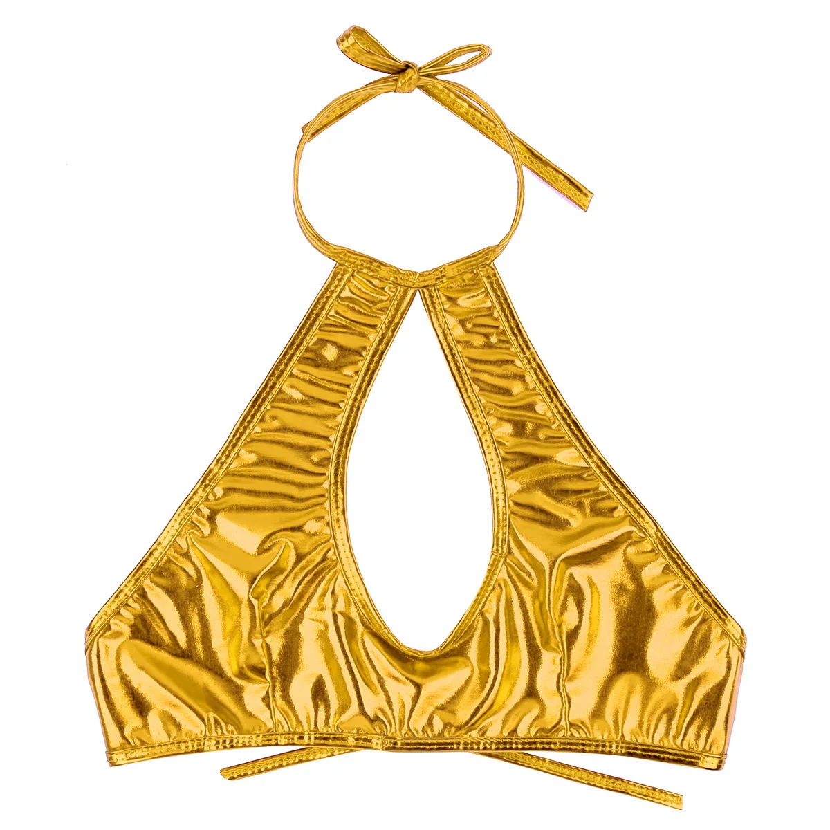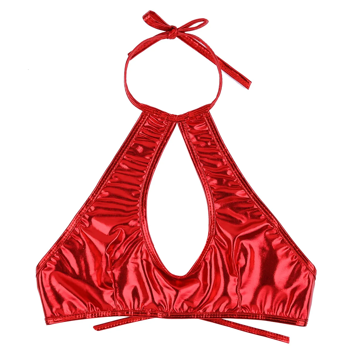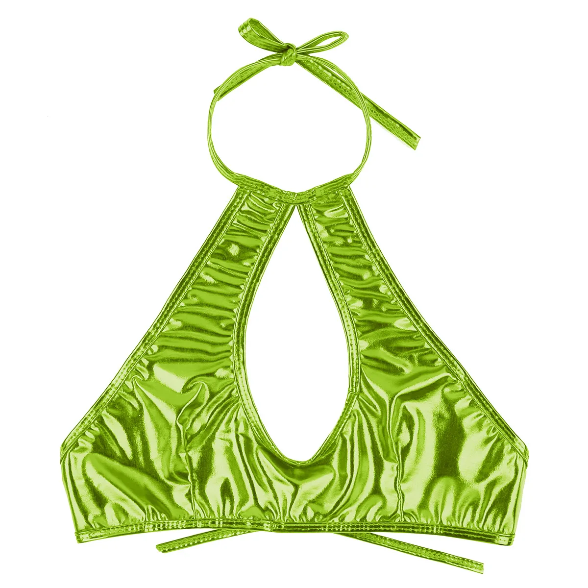 Femme Womens Fashion Top Women Shiny Metallic Faux Leather Sleeveless Halter Neck Cut Out Strappy Crop Tops Sexy Clubwear Vest