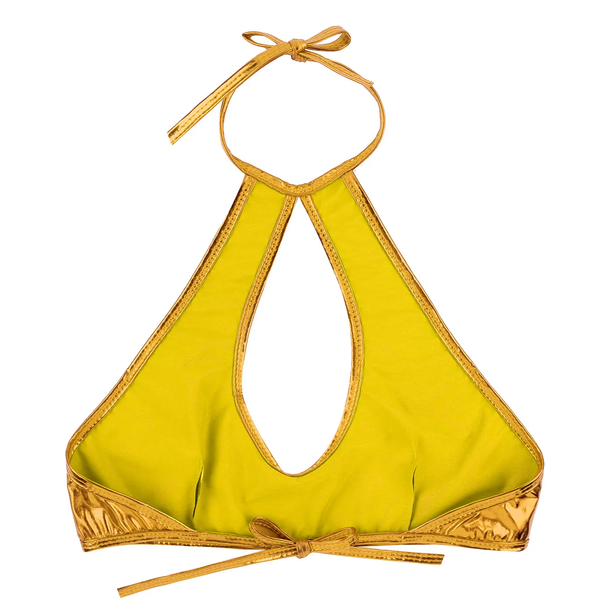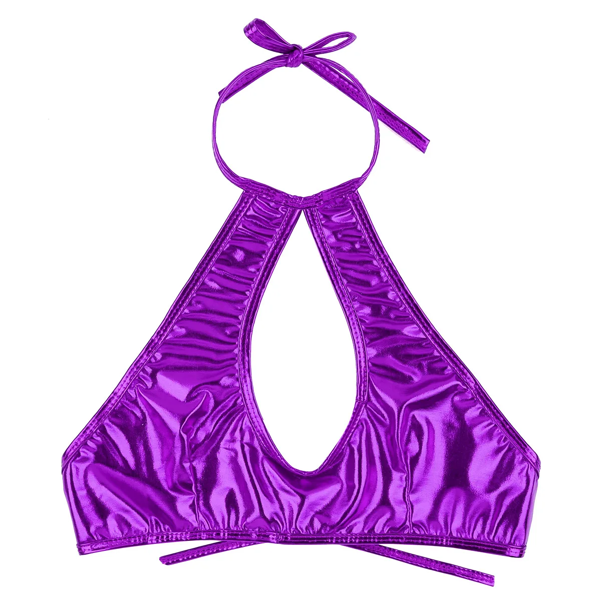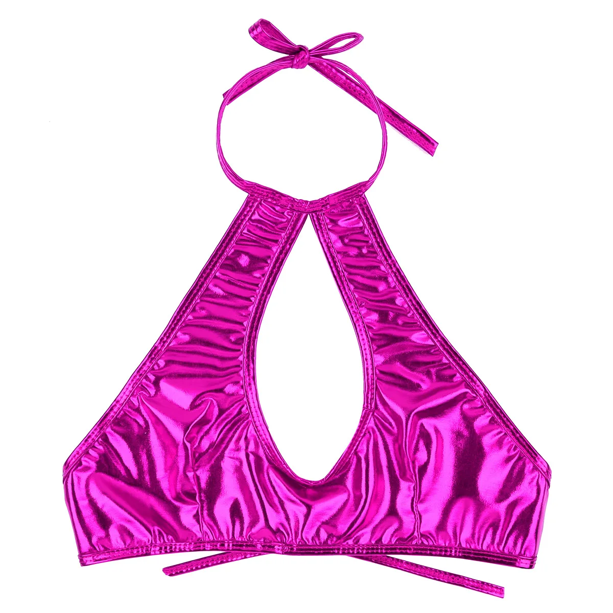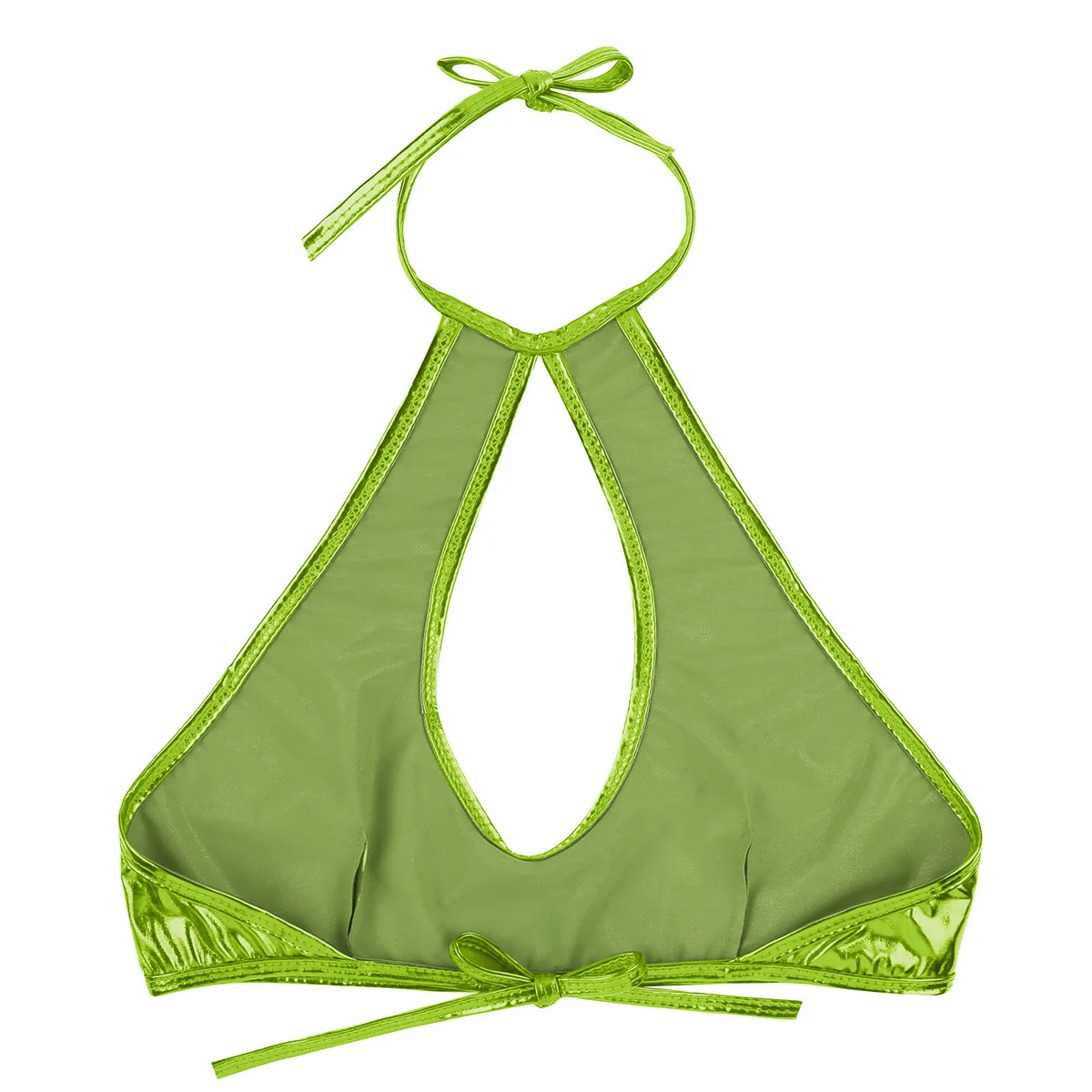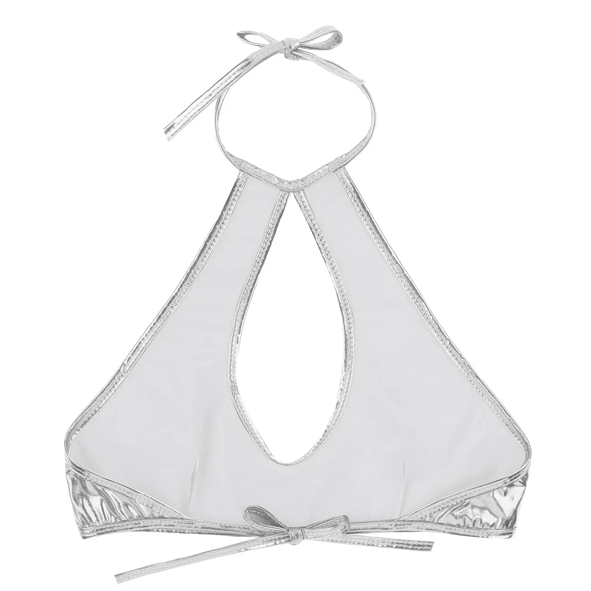 Femme Womens Fashion Top Women Shiny Metallic Faux Leather Sleeveless Halter Neck Cut Out Strappy Crop Tops Sexy Clubwear Vest