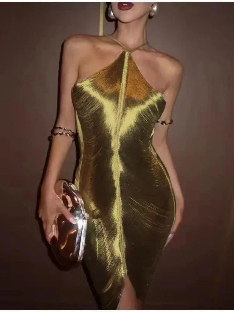 Fringe V-neck Mini Dress Halterneck Vestidos Women Elegant Cut Out Short Dress Fashion Patchwork Asymmetric Tassel Decor Dresses