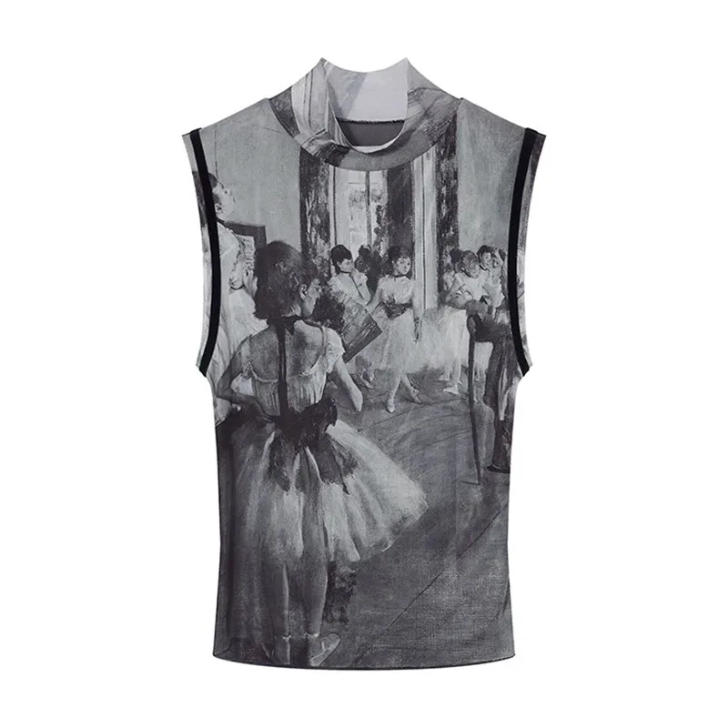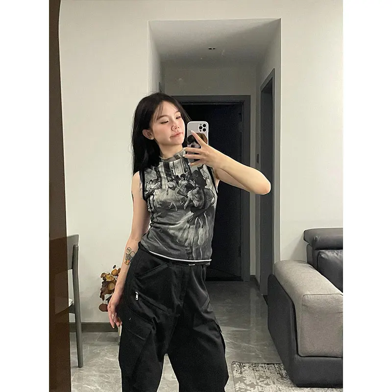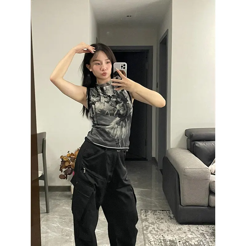 Genayooa Y2k Vintage Tank Tops Women Print Mesh Tops See Through Streetwear Sleeveless Tops Patchwork 2000s Japanese Tee Tops