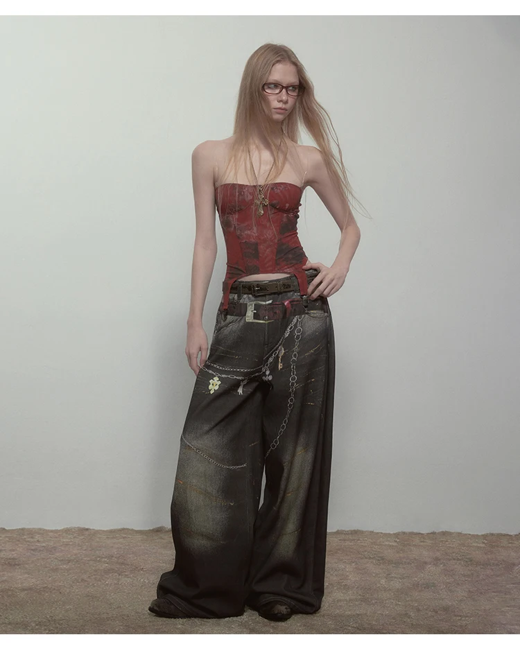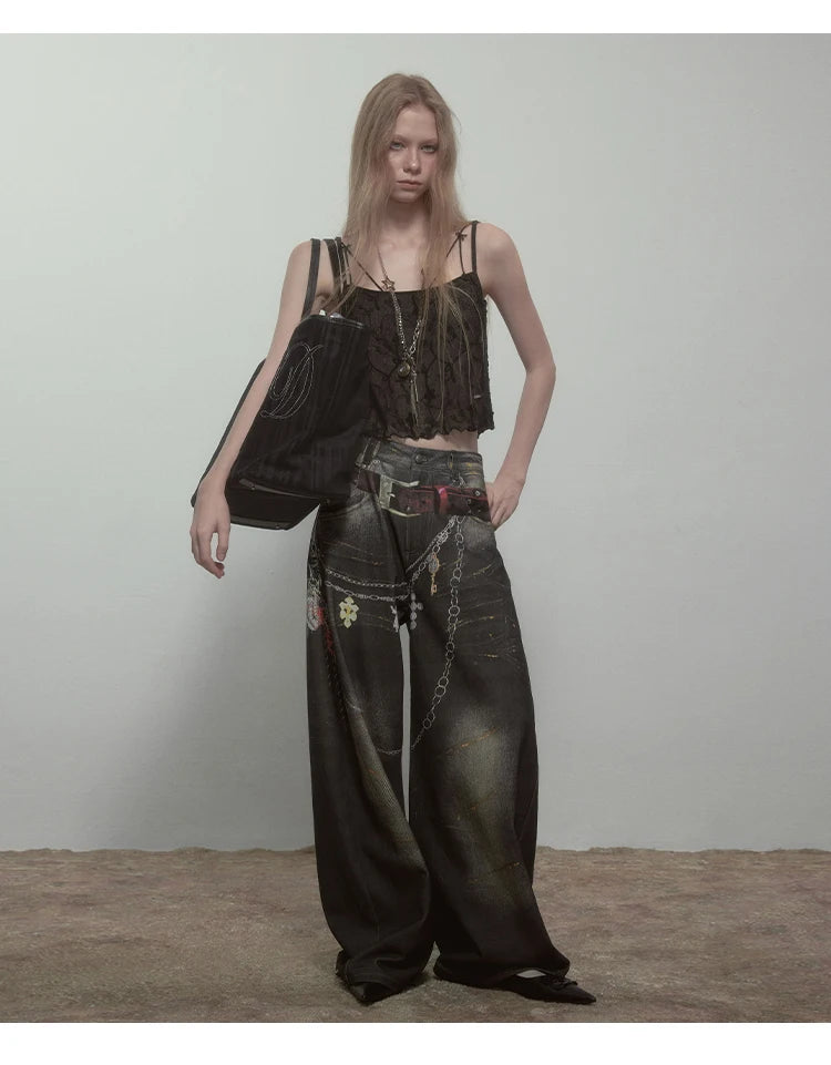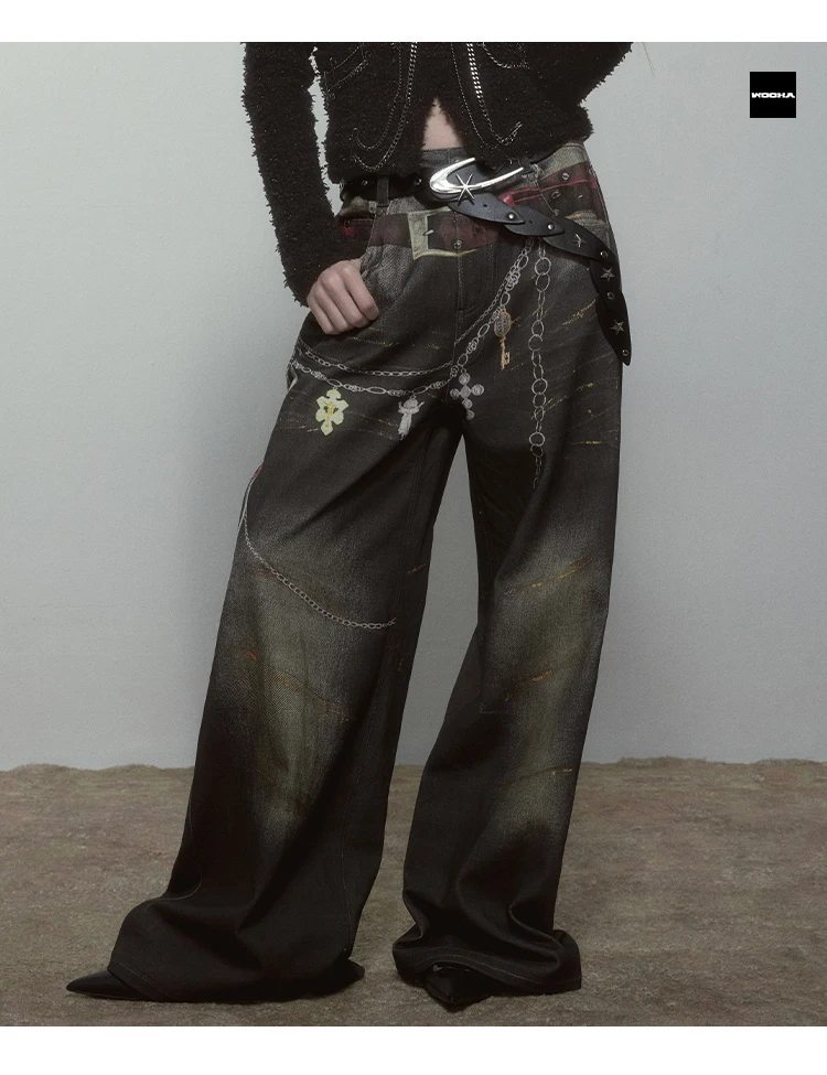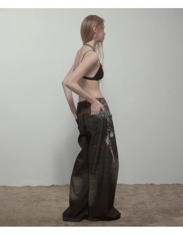 High Quality Hot Selling Wholesale 2025 New Virtual Digital Printed Retro Fashionable Personalized Wide Leg Jeans Pants Women