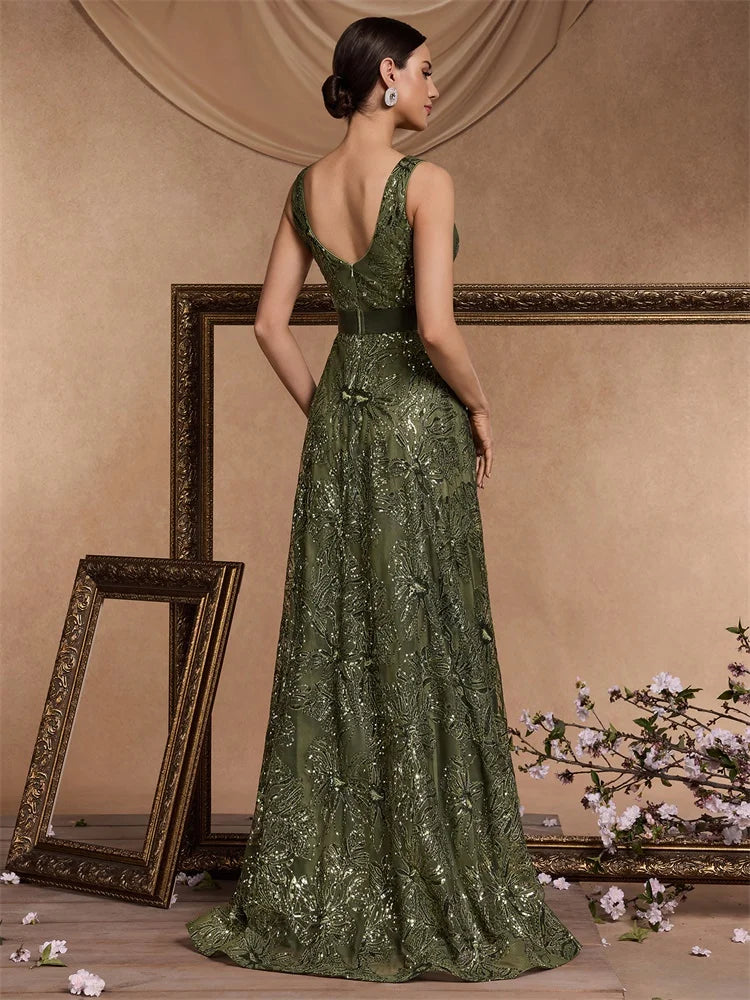 Luxury Sexy Deep V-Neck Sequins Blue Evening Dresses Women Elegant V-back Wedding Party Long Prom Cocktail Dress