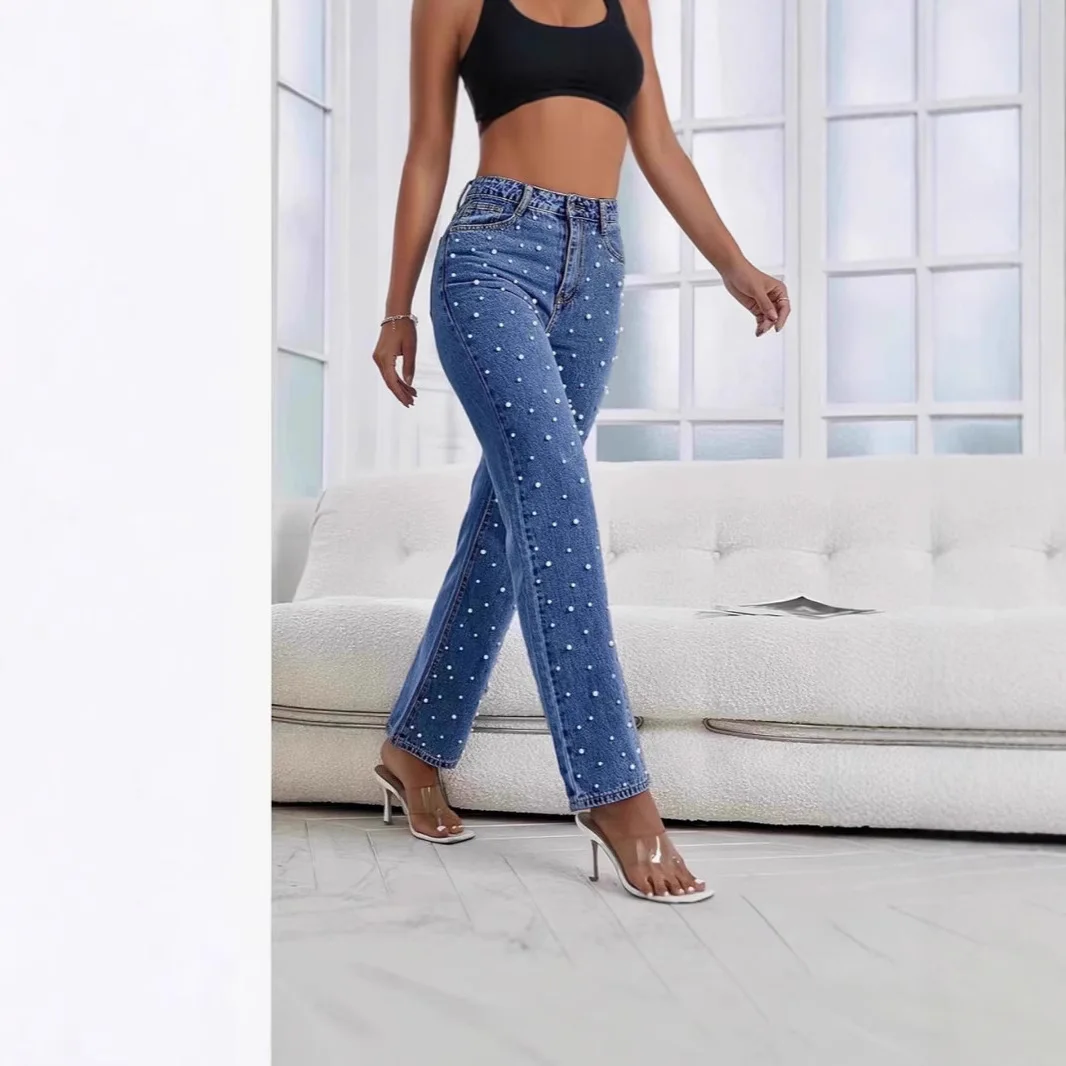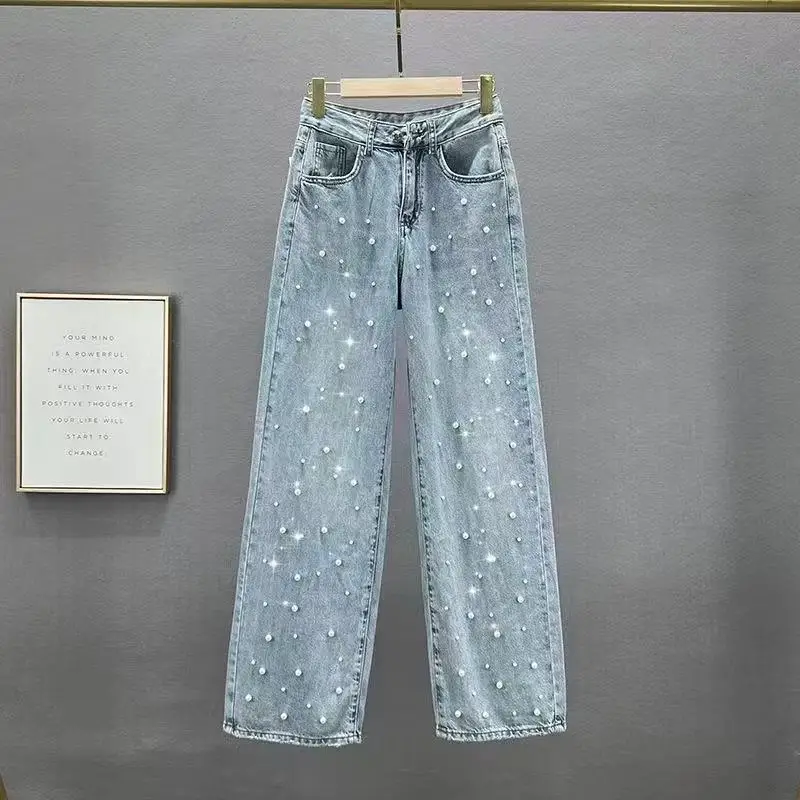 New 2026 Women's Jeans Pants Beading High Waist Casual Straight Pants for Women Streetwear Elegant Splice Denim Female Trousers