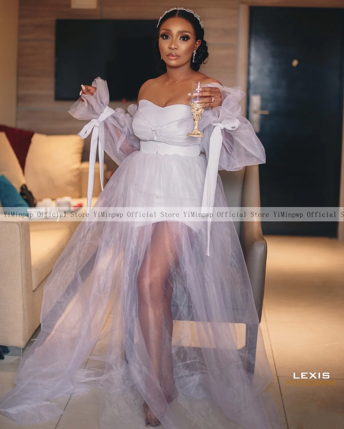 New Wedding Dresses Bride Robes Bridal Shower Gown Off Shoulder Sweet Heart Side Split A line Ruffles Covered Button Customized