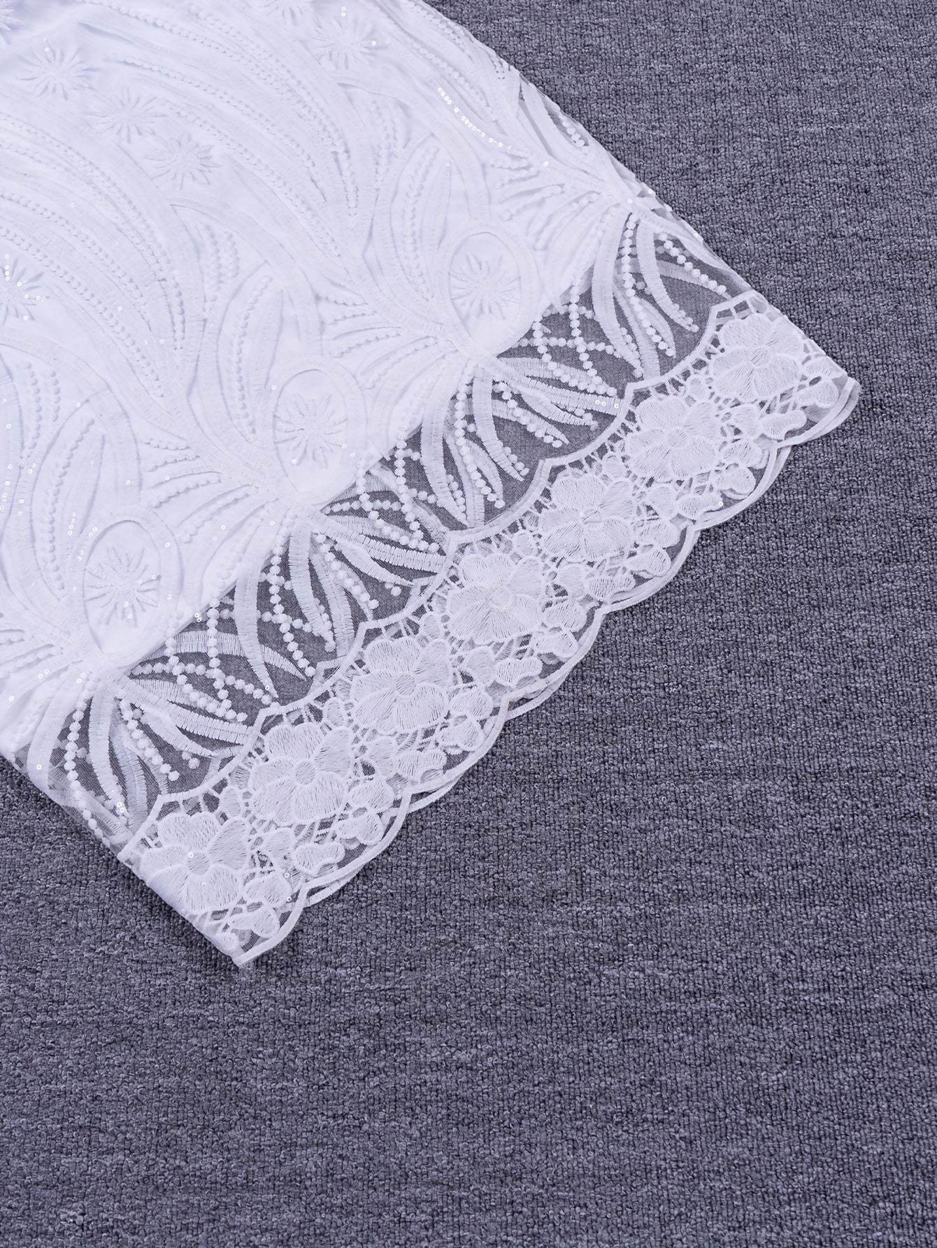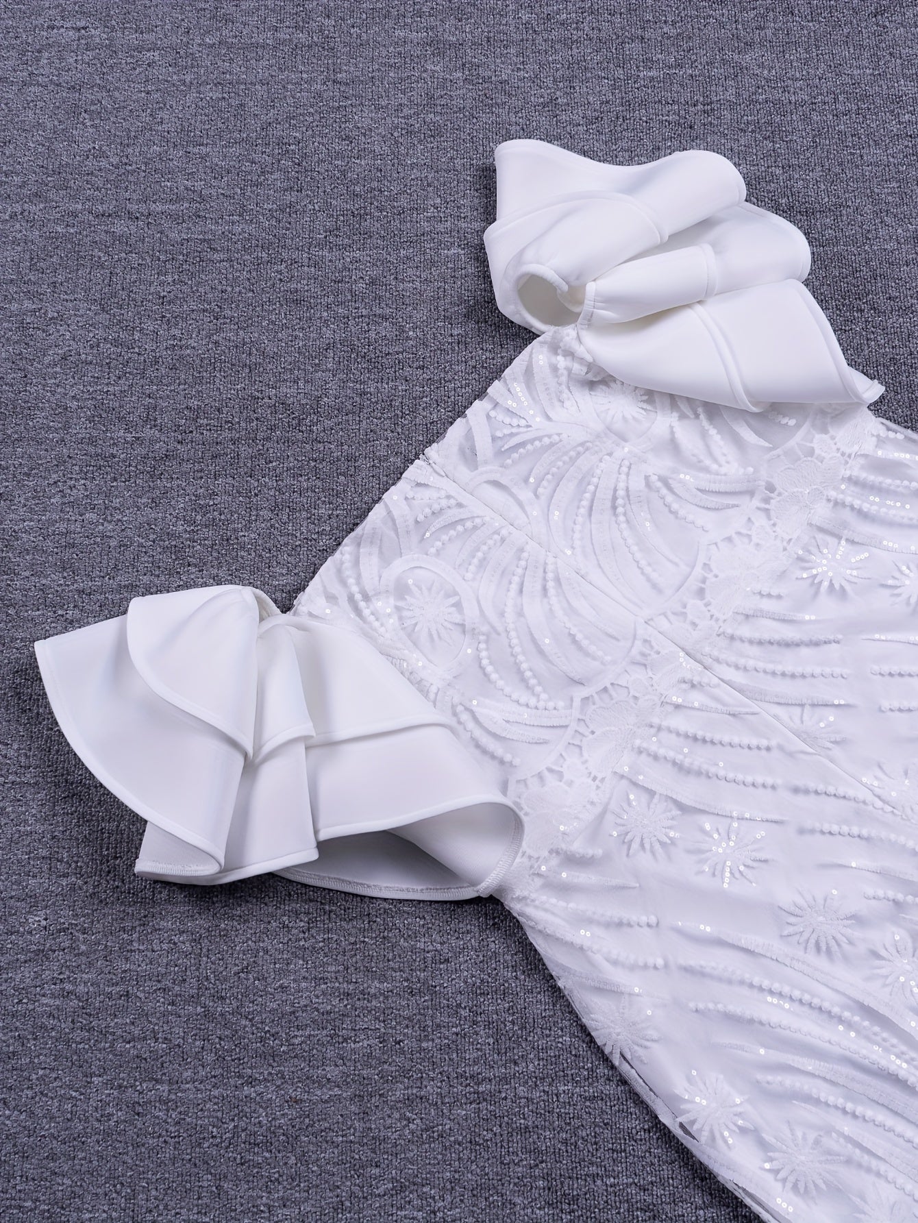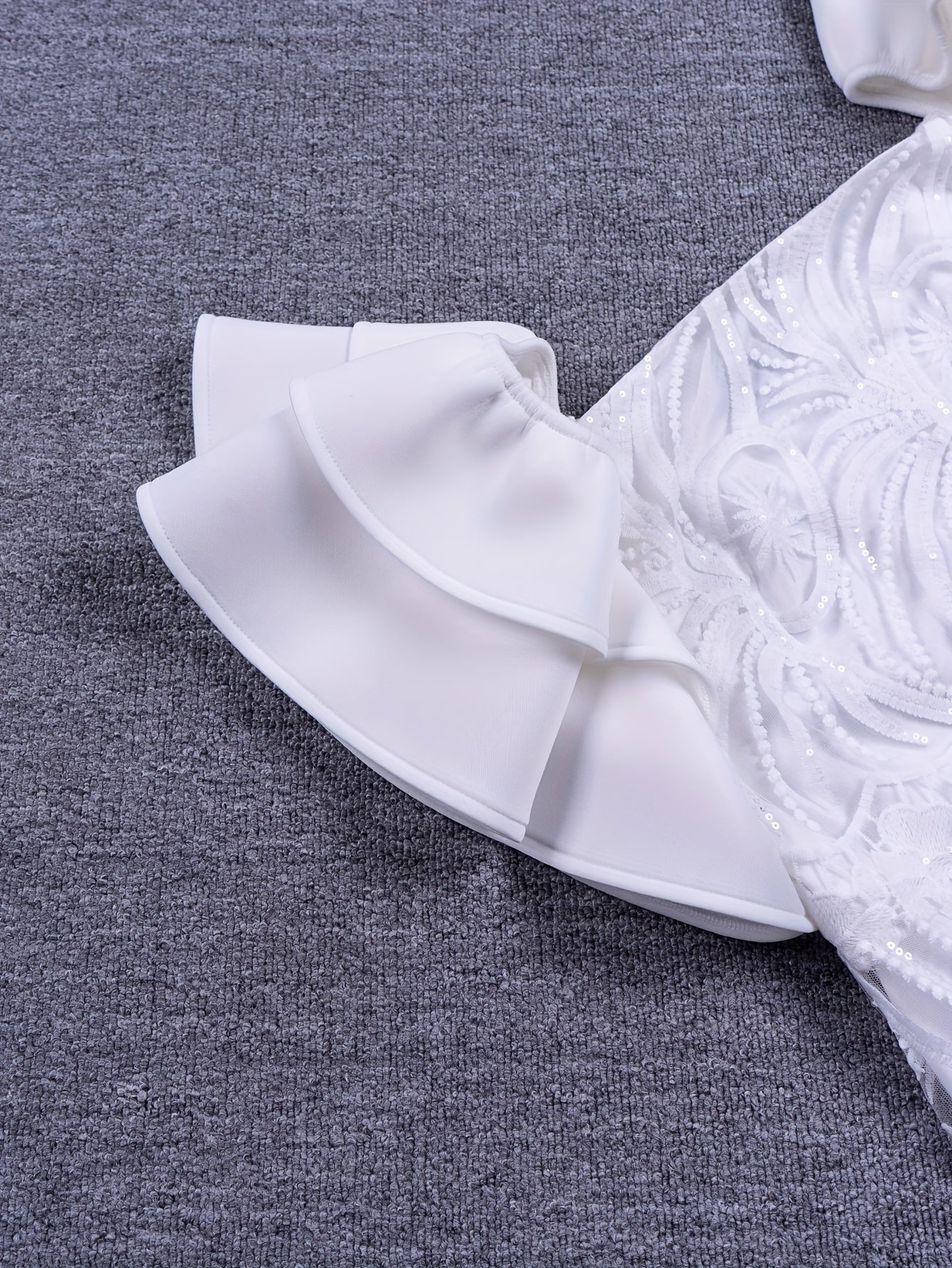 Plus Size Jacquard Cold Shoulder Wedding Dress, Elegant Lace Trim Ruffle Sleeve Bodycon Party Dress, Women's Plus Size Clothing