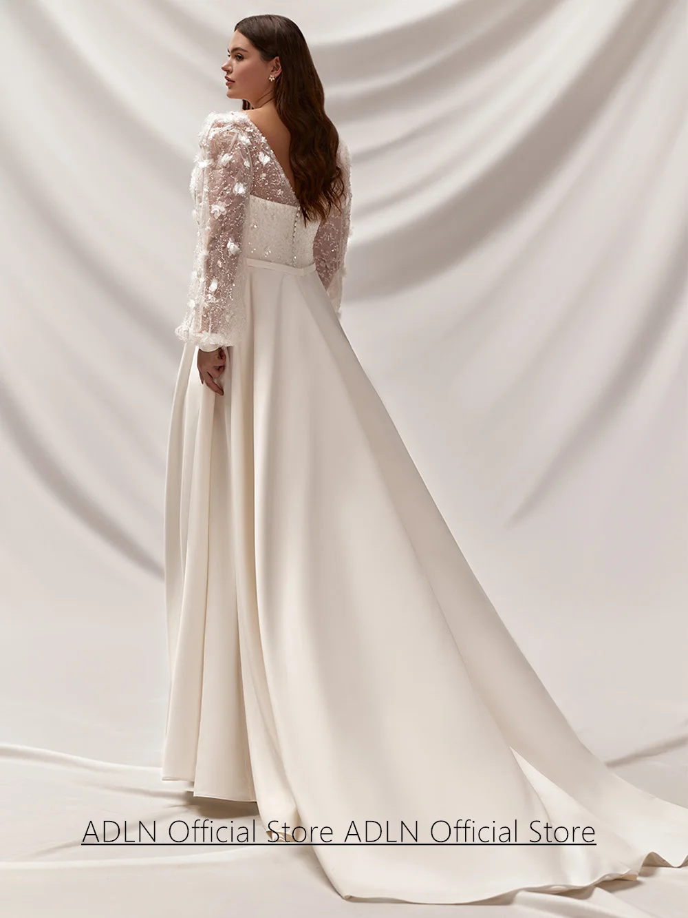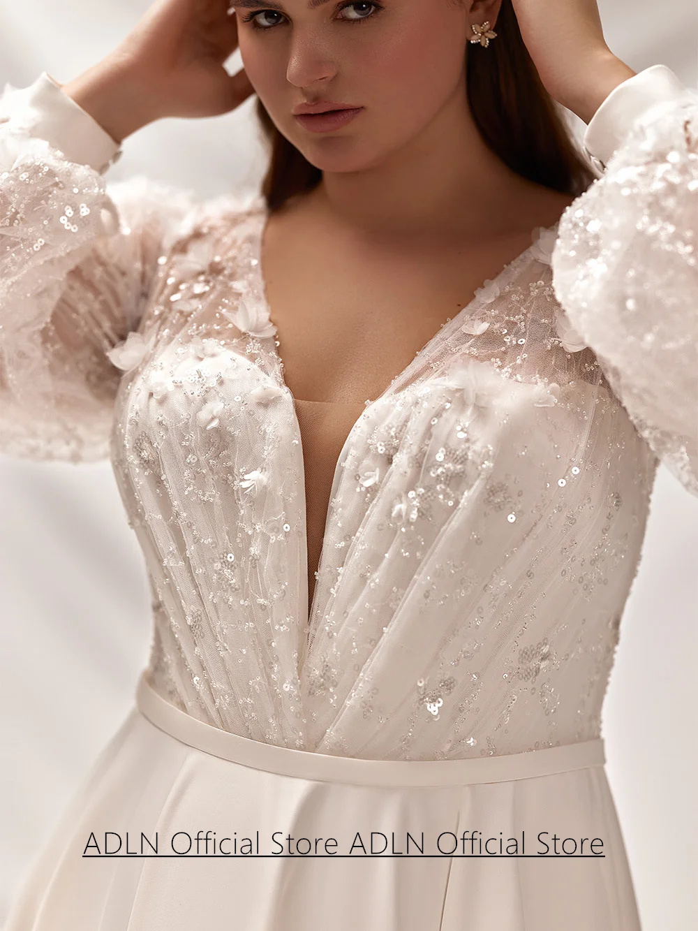 Plus Size Wedding Dress for Bride Customized Deep V Neck Puff Sleeves Sequined Lace A Line Sweep Train Bridal Gowns