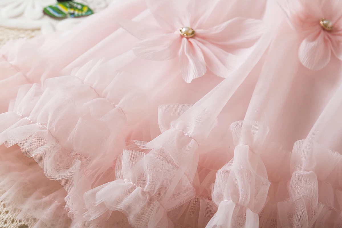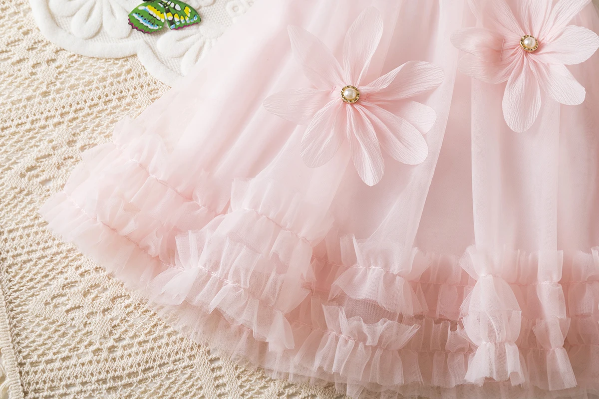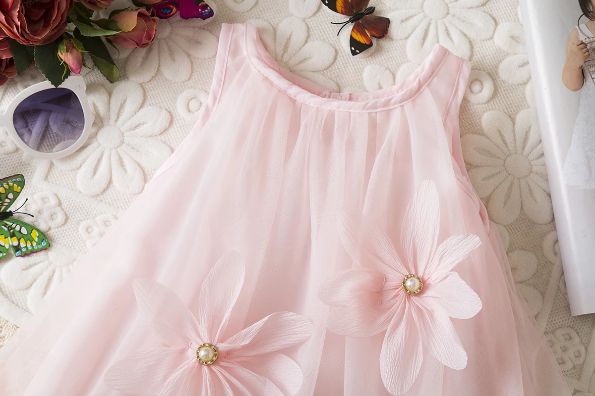 Toddler Girl Princess Dress Pink Flower Decorated Sleeveless Gauze Dress Elegant Girl Wedding Party Dress for Party