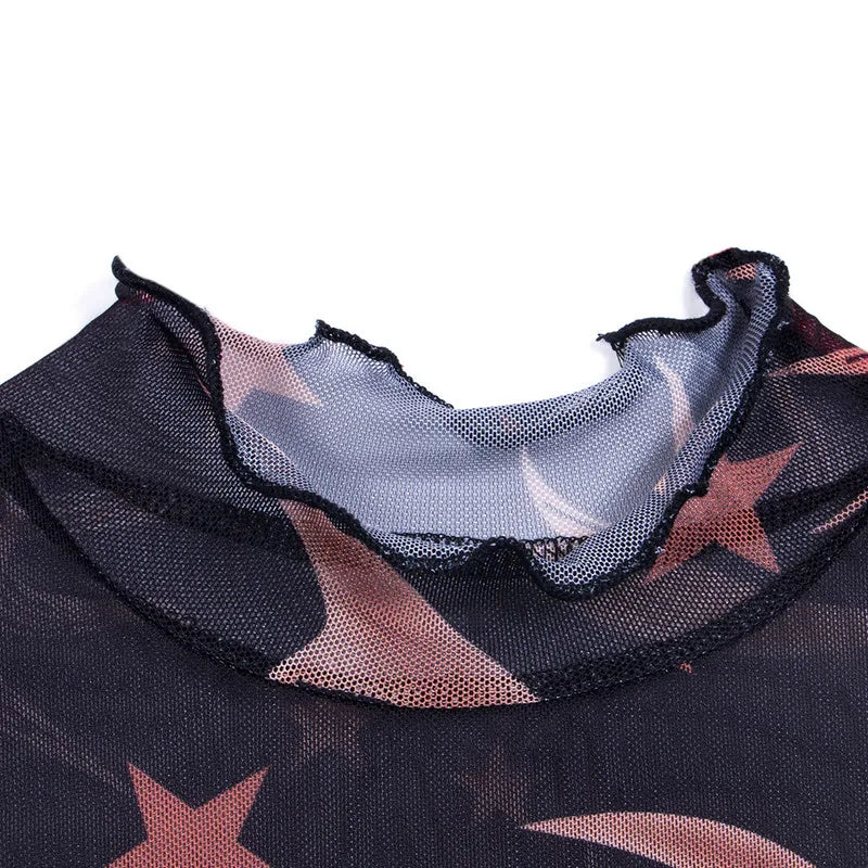 Top Women See-through Crop Tops Summer Clothes Transparent Moon Star Print Short Sleeve Ruffle T-shirt Sexy Club y2k Streetwear