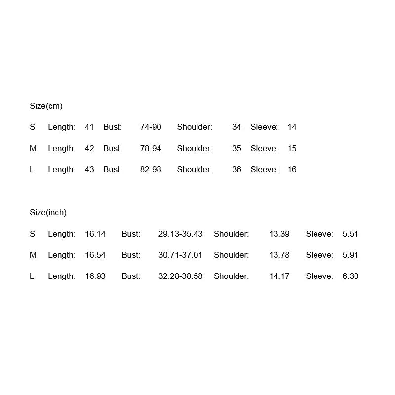 M Length: 16.54 Bust: 30.71-37.01 Shoulder: 13.78 Sleeve: 5.91