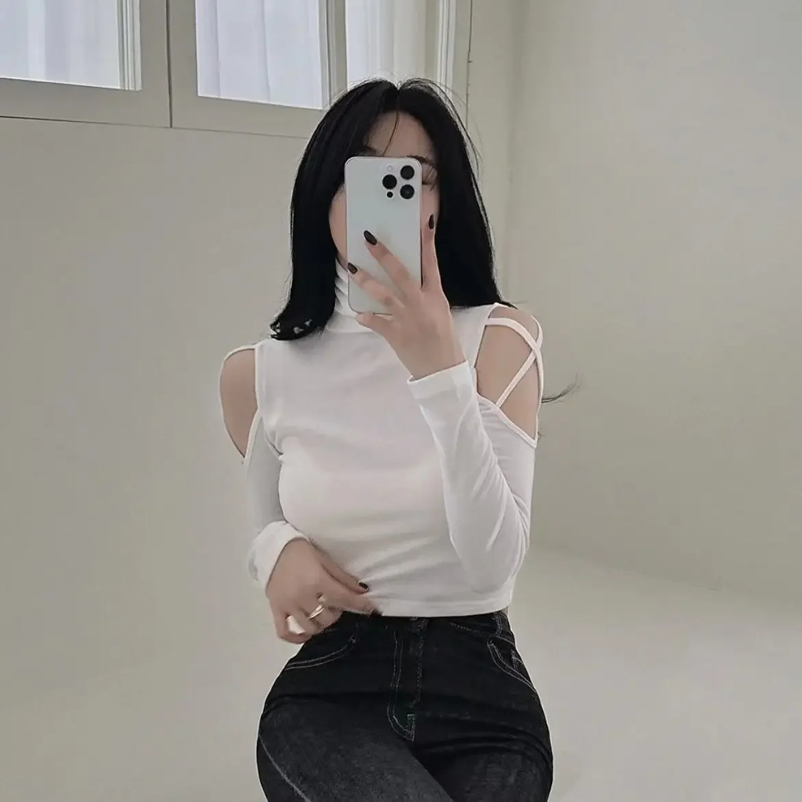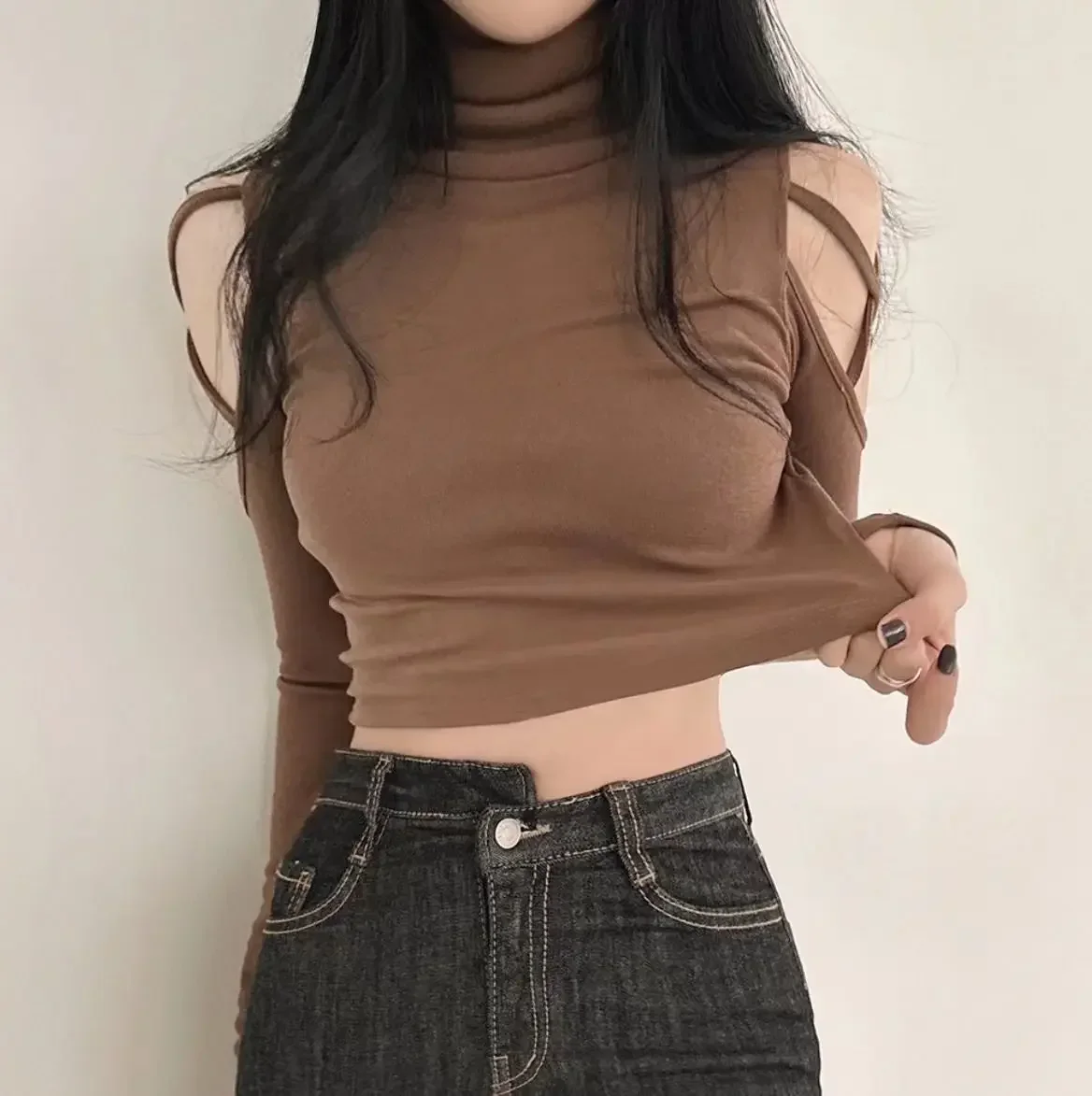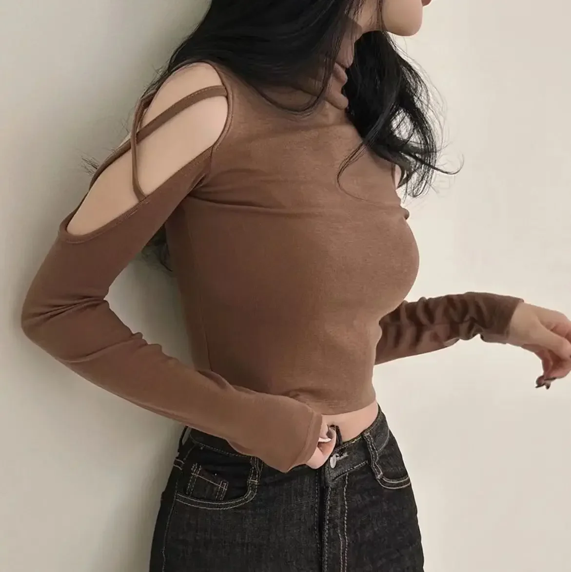 Tops Woman Slim Off Shoulder Sexy Crop Brown Long Sleeve T Shirt for Women Turtleneck Clothing Female Harajuku Fashion Korean
