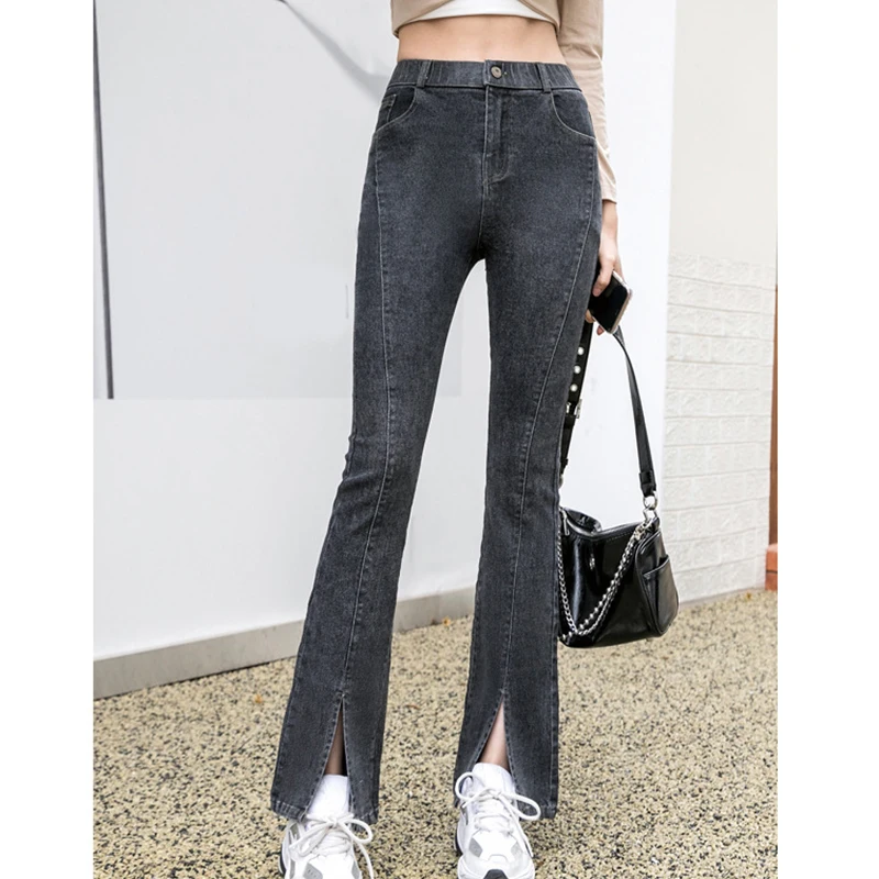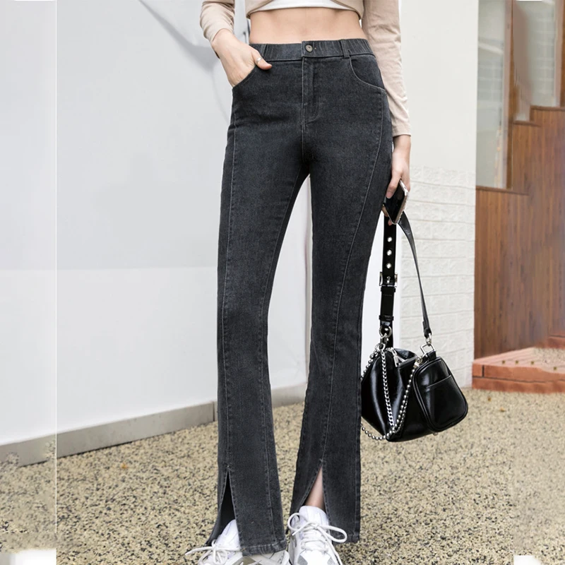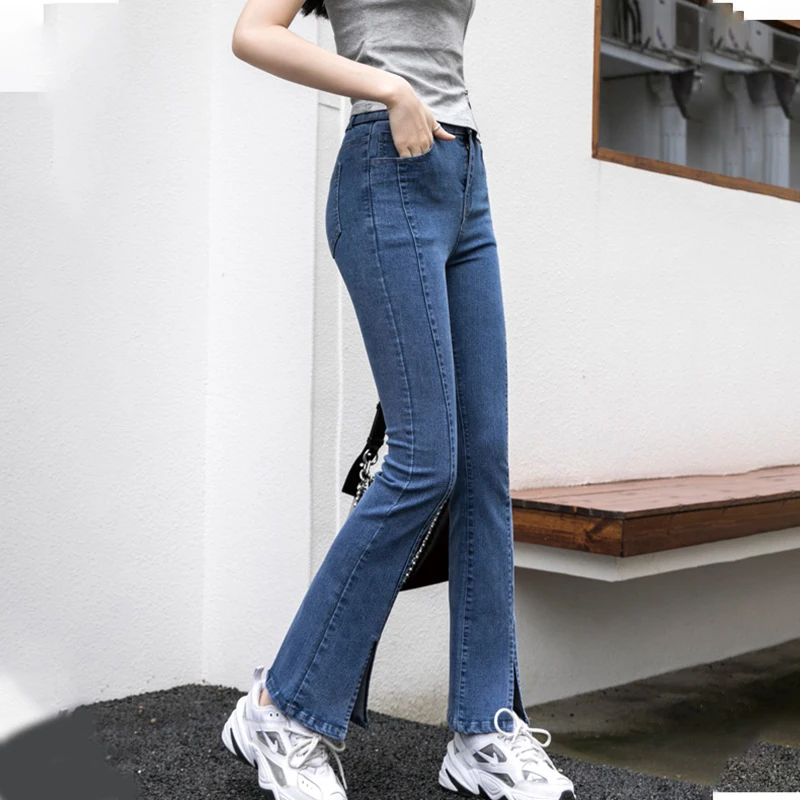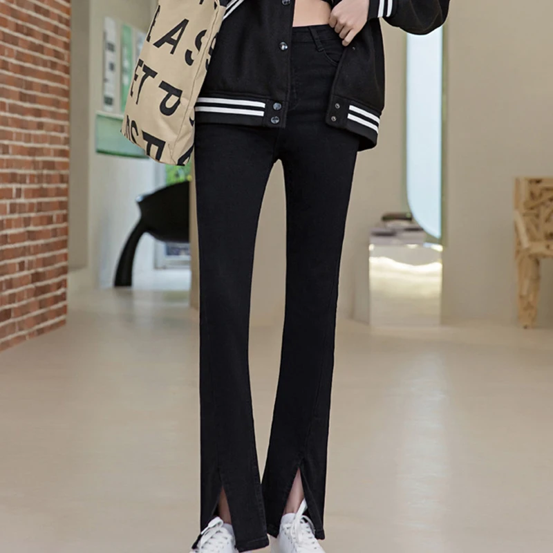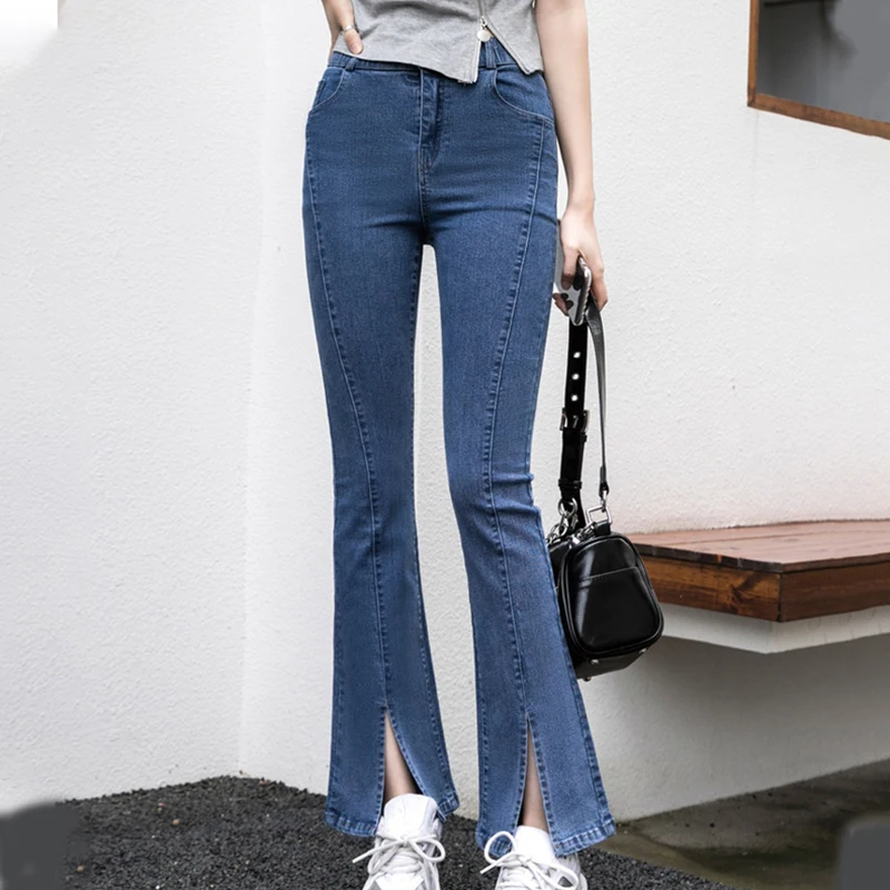 Women Fashion Split Micro Flared Jeans Korean Skinny High Waist Slim Denim Pants Simple Versatile Solid Stretchy Jean Trousers