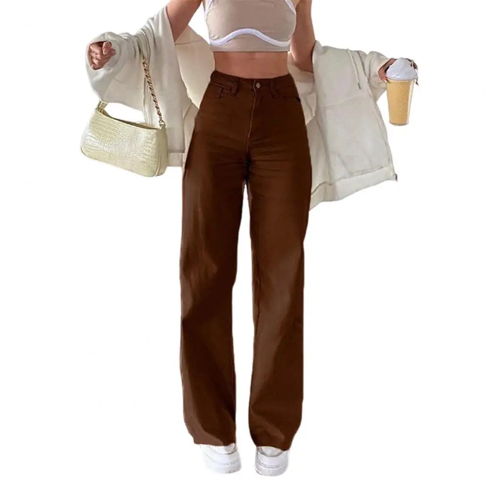 Women Jeans with Pockets High Waist Button Zipper Closure Straight Pants Solid Color Vintage American Style Denim Trousers for Daily Wear Scool Commuting