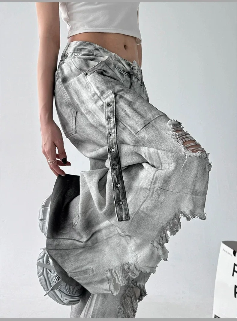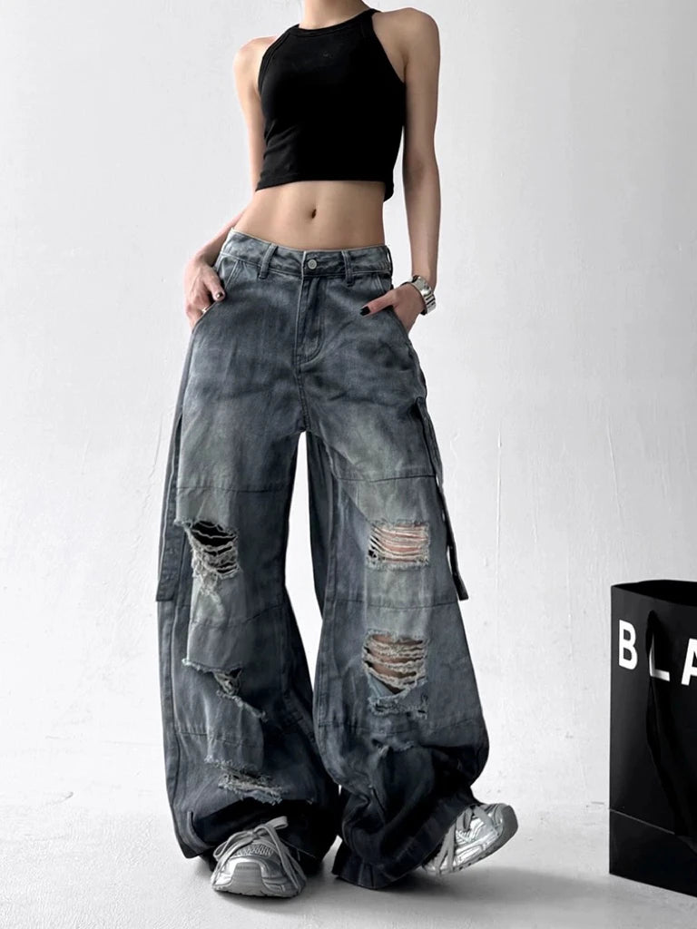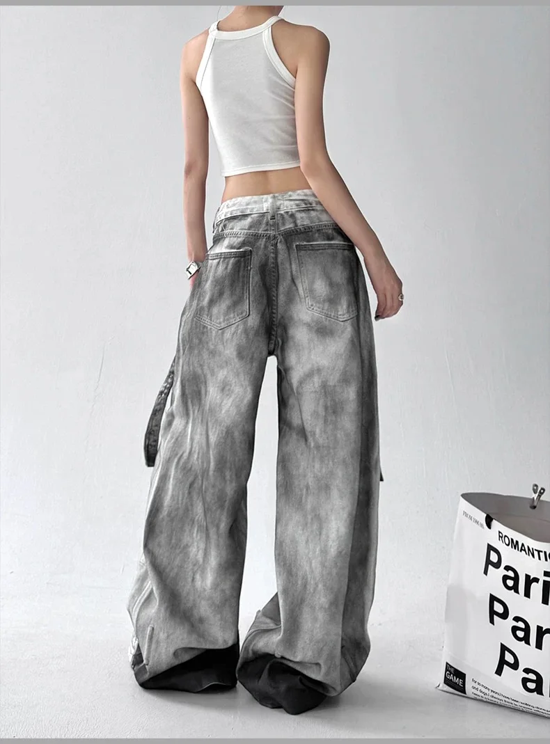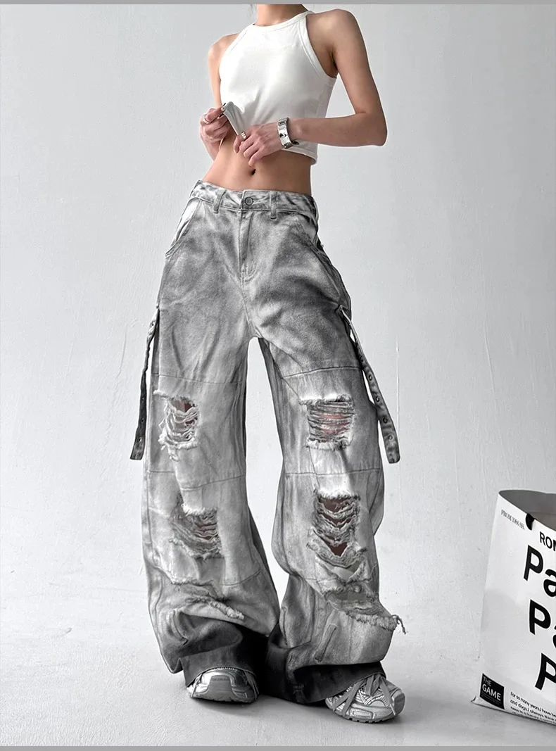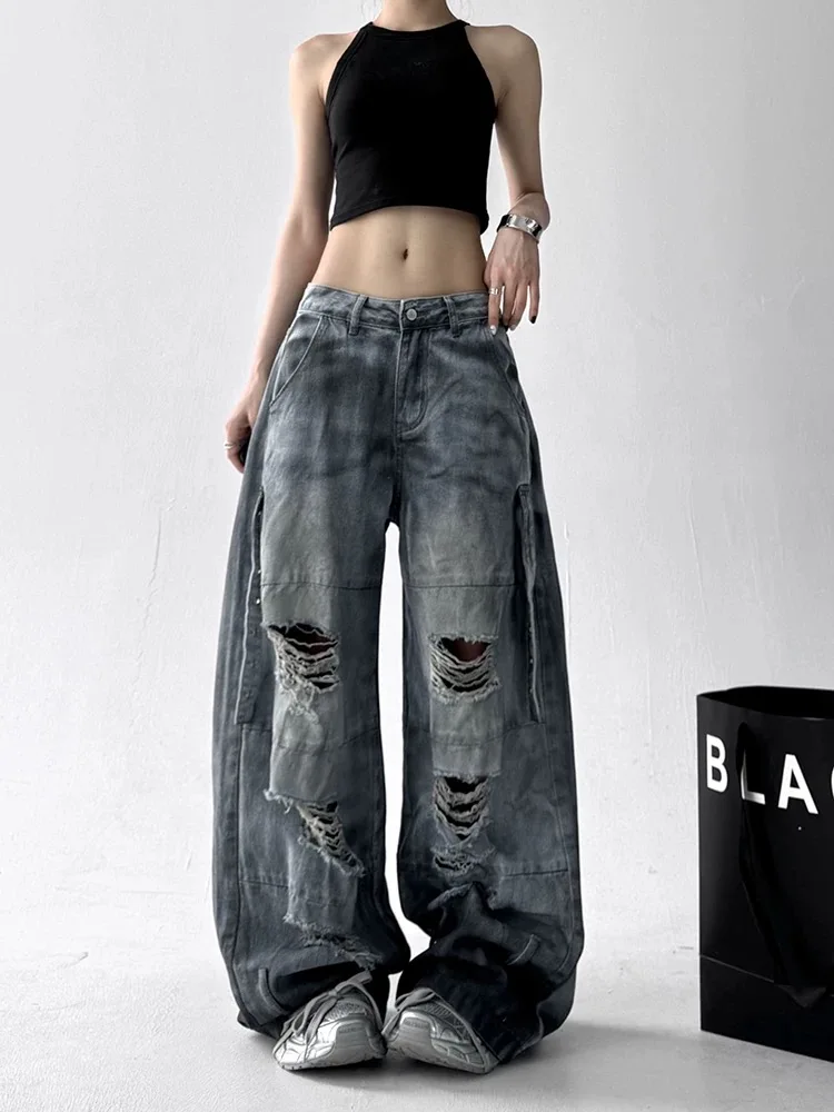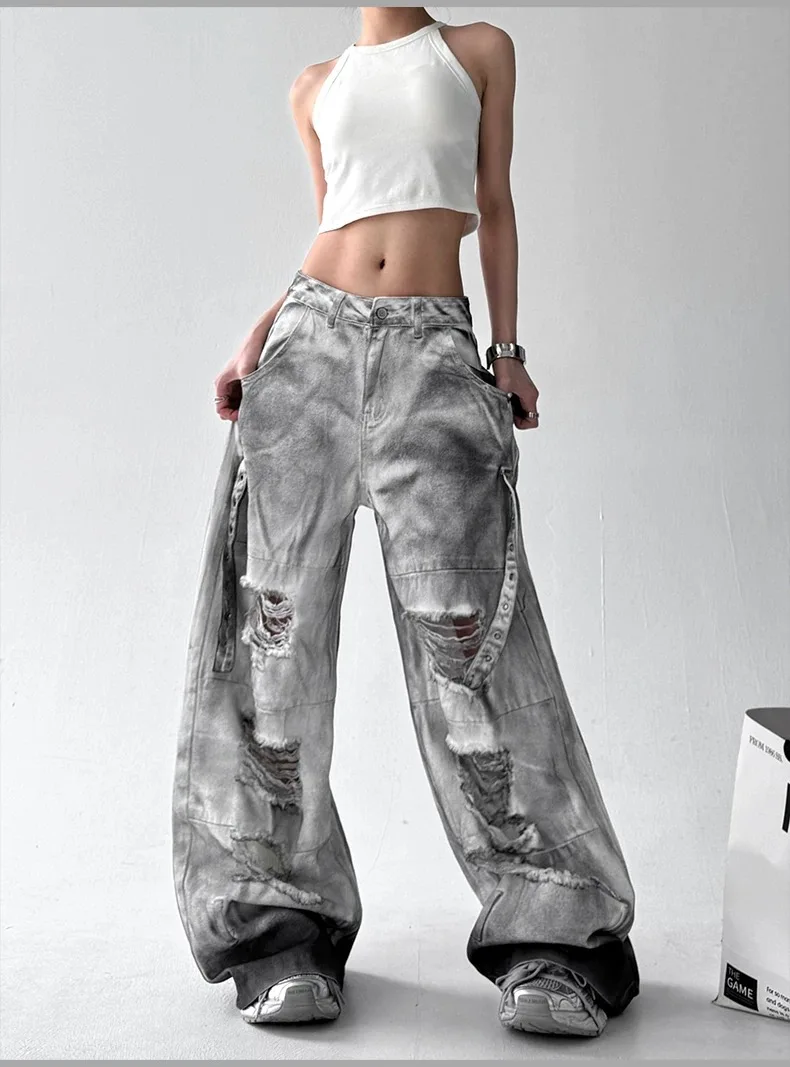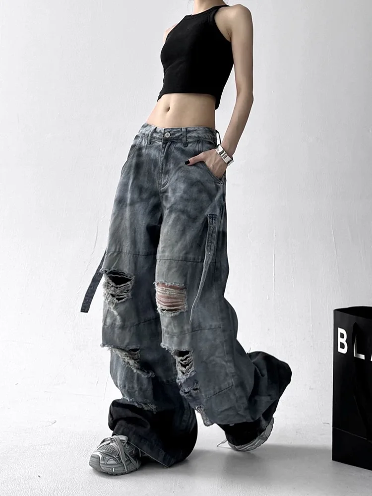 Women Tie Dye Ripped Jeans Woman Abandoned Soil Style Wide Leg Pants Summer Loose Workwear Denim Retro Vintage Trousers