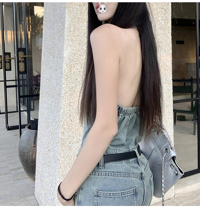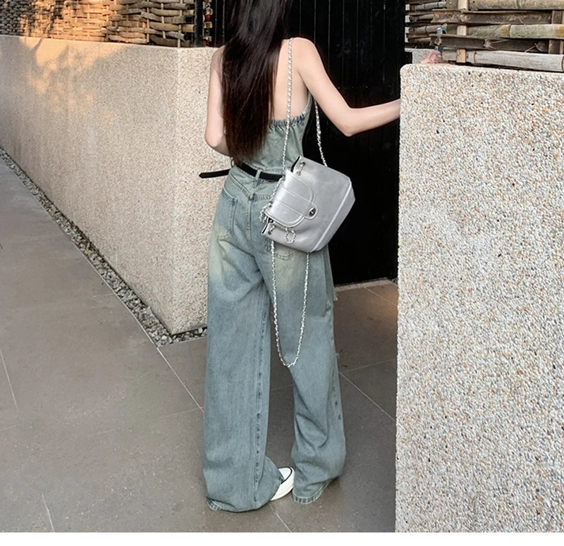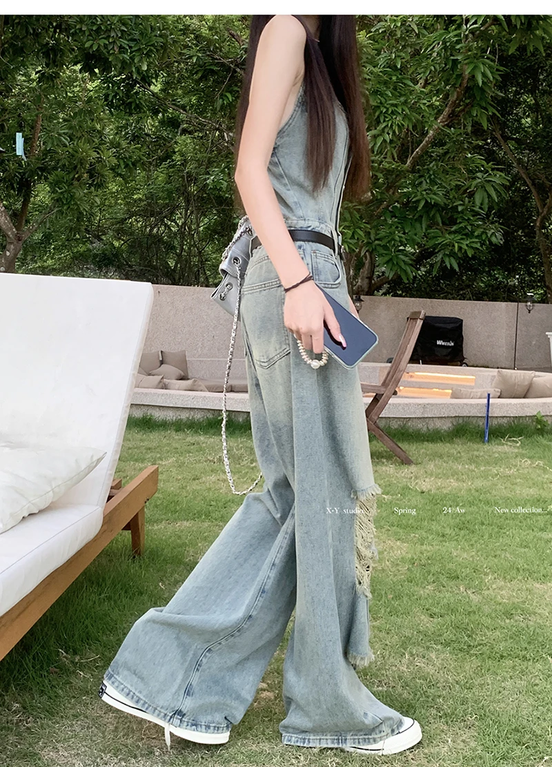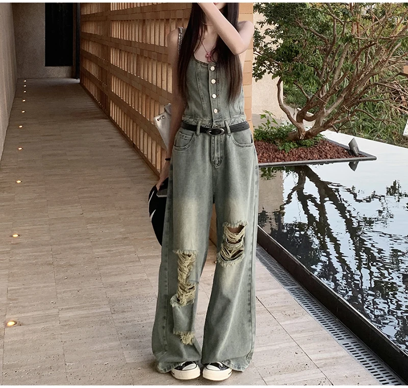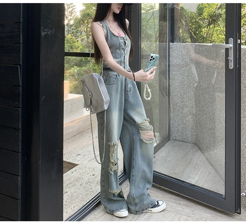 Women's Casual Denim Overalls Vintage Button Down Sexy Backless Holes Hollow Out Ripped Denim Full Pants Female 2024 New Jeans
