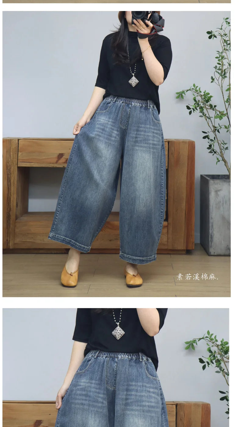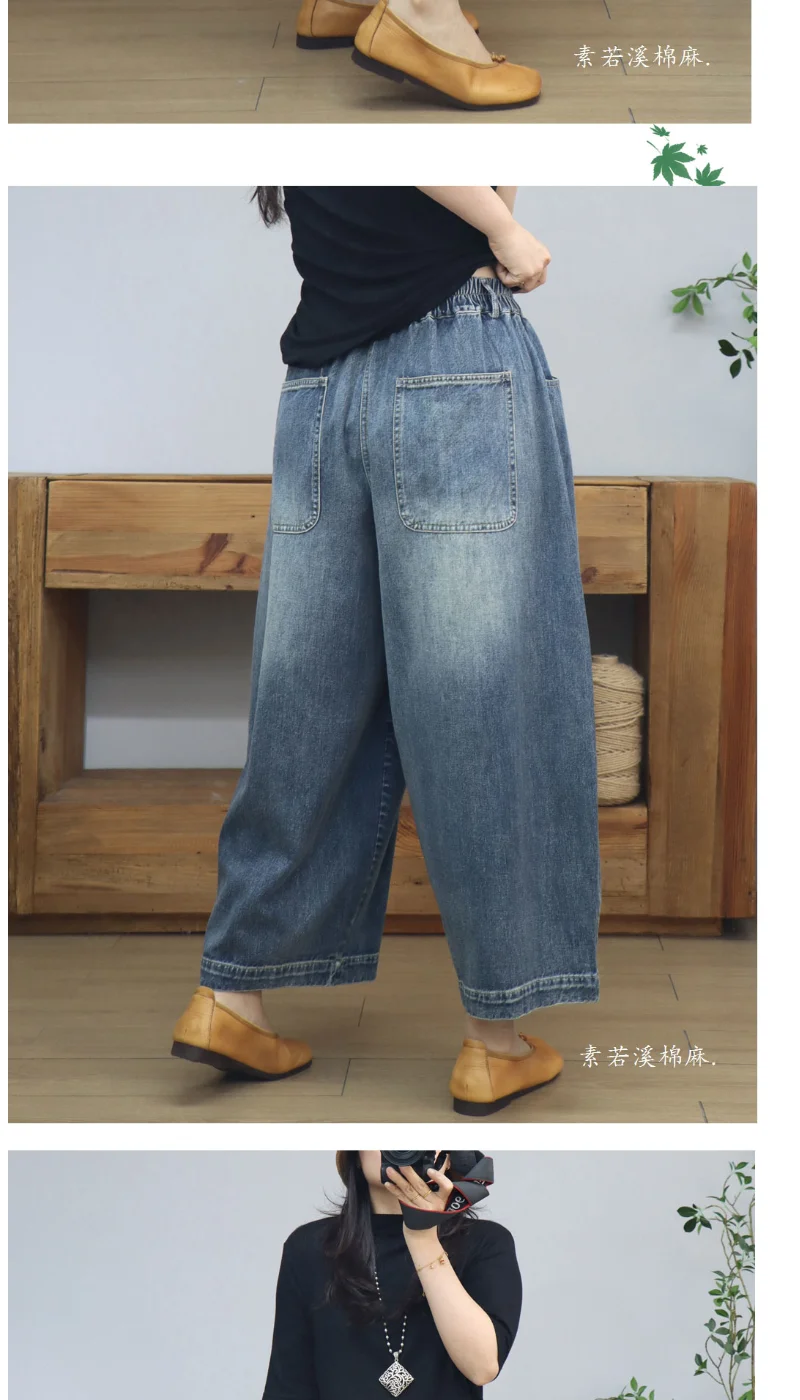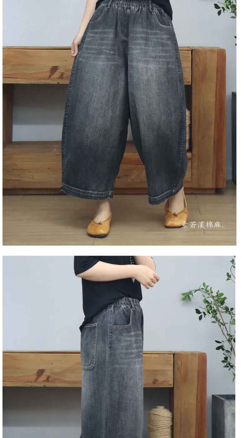 Women's Elastic Waist Jeans Drawstring Big Pocket Wide Leg Solid Color Simple Basic Harem Trouser Female Autumn Denim Pants