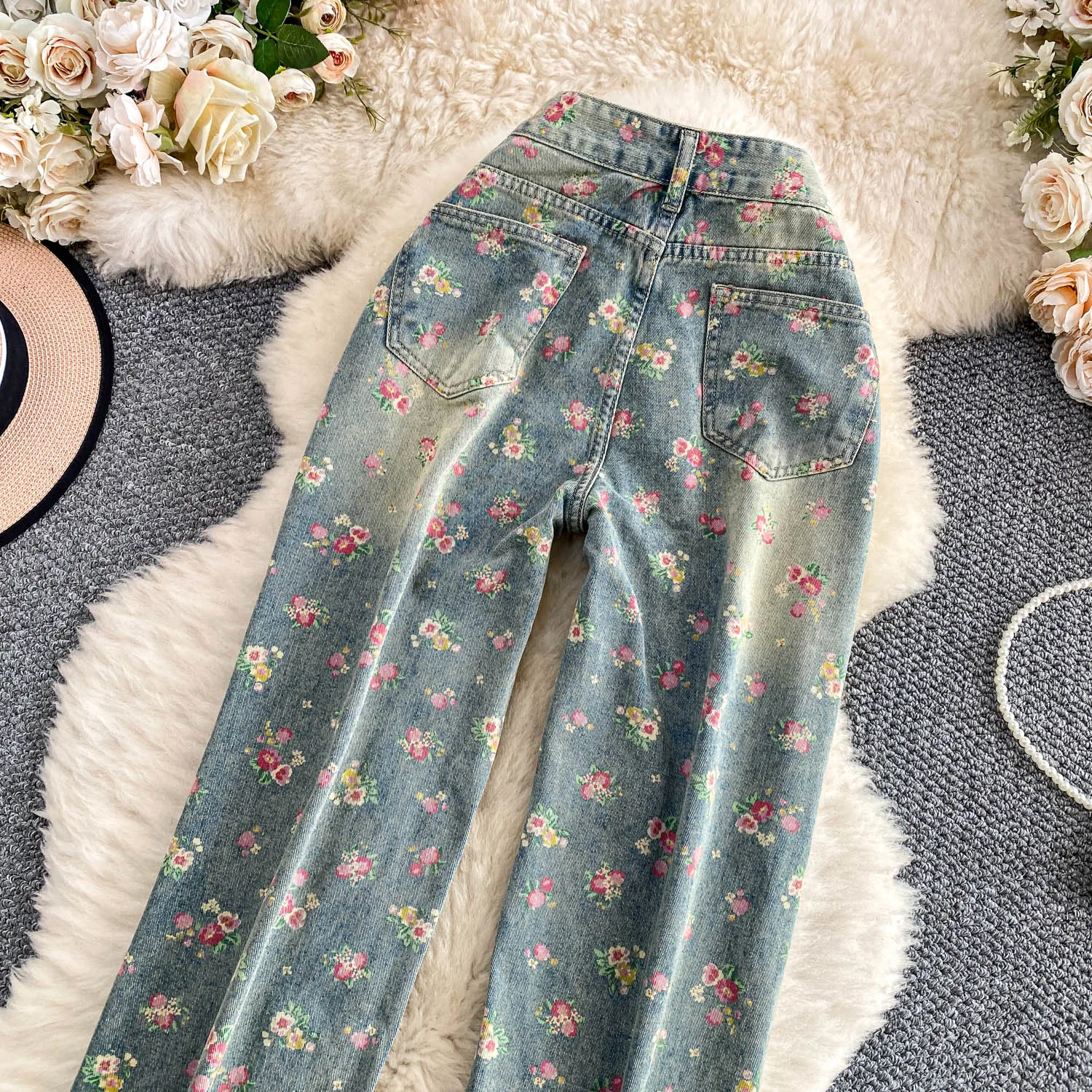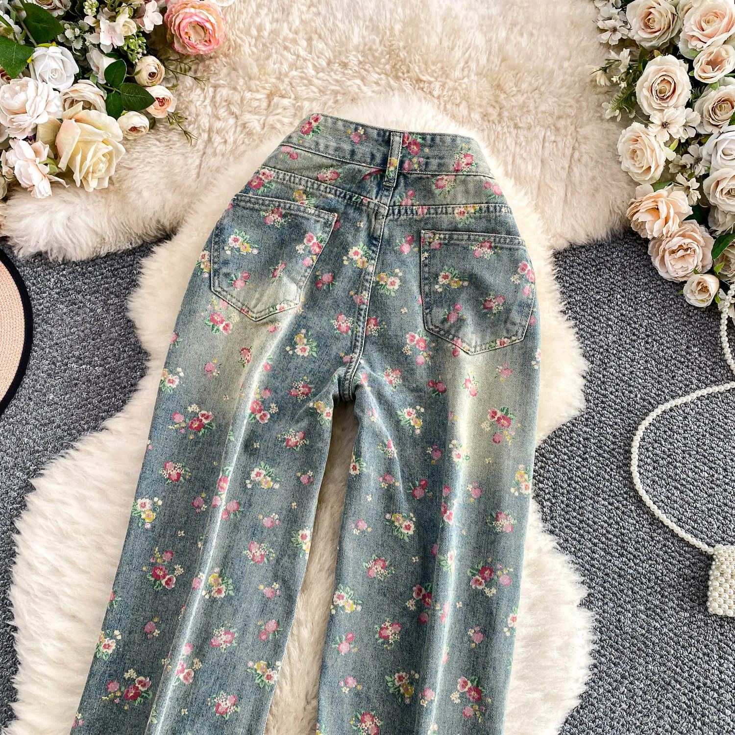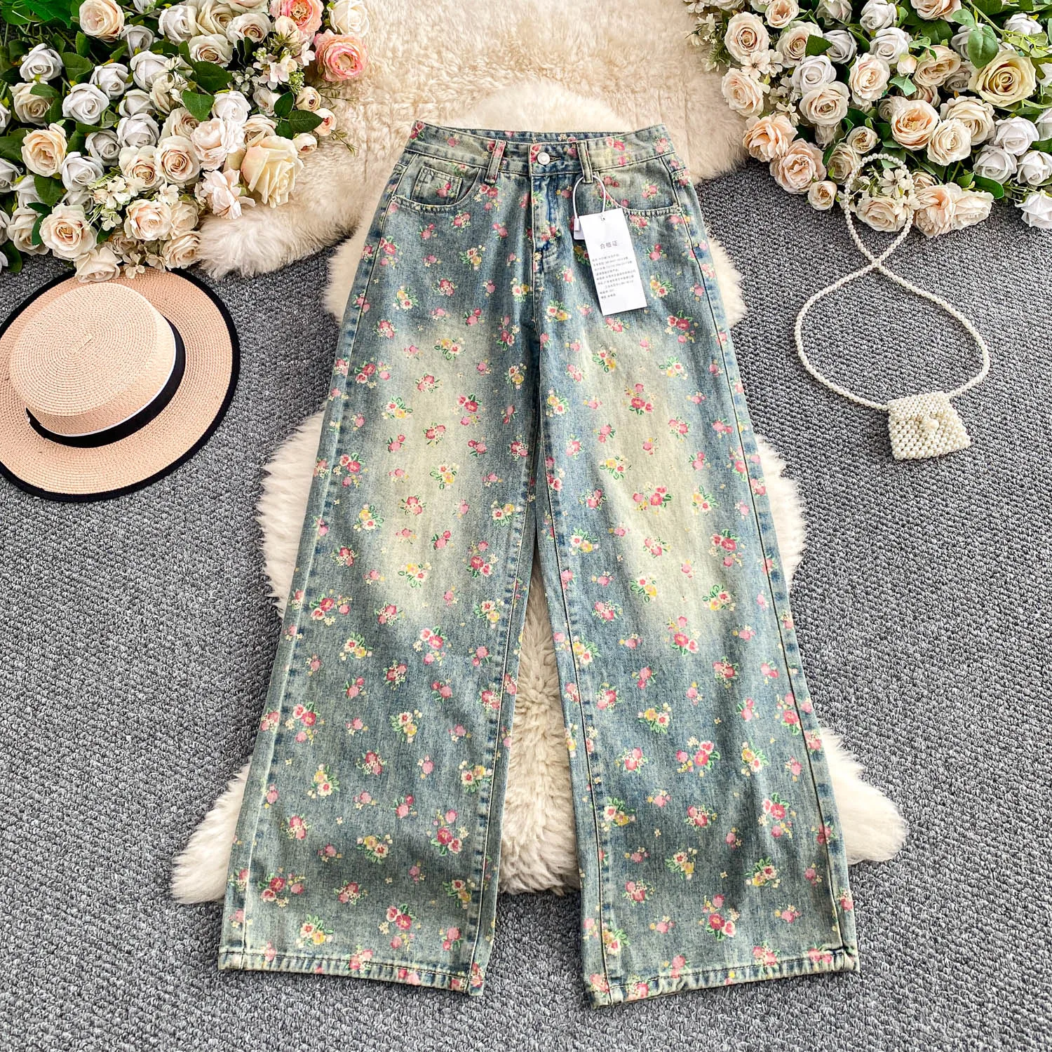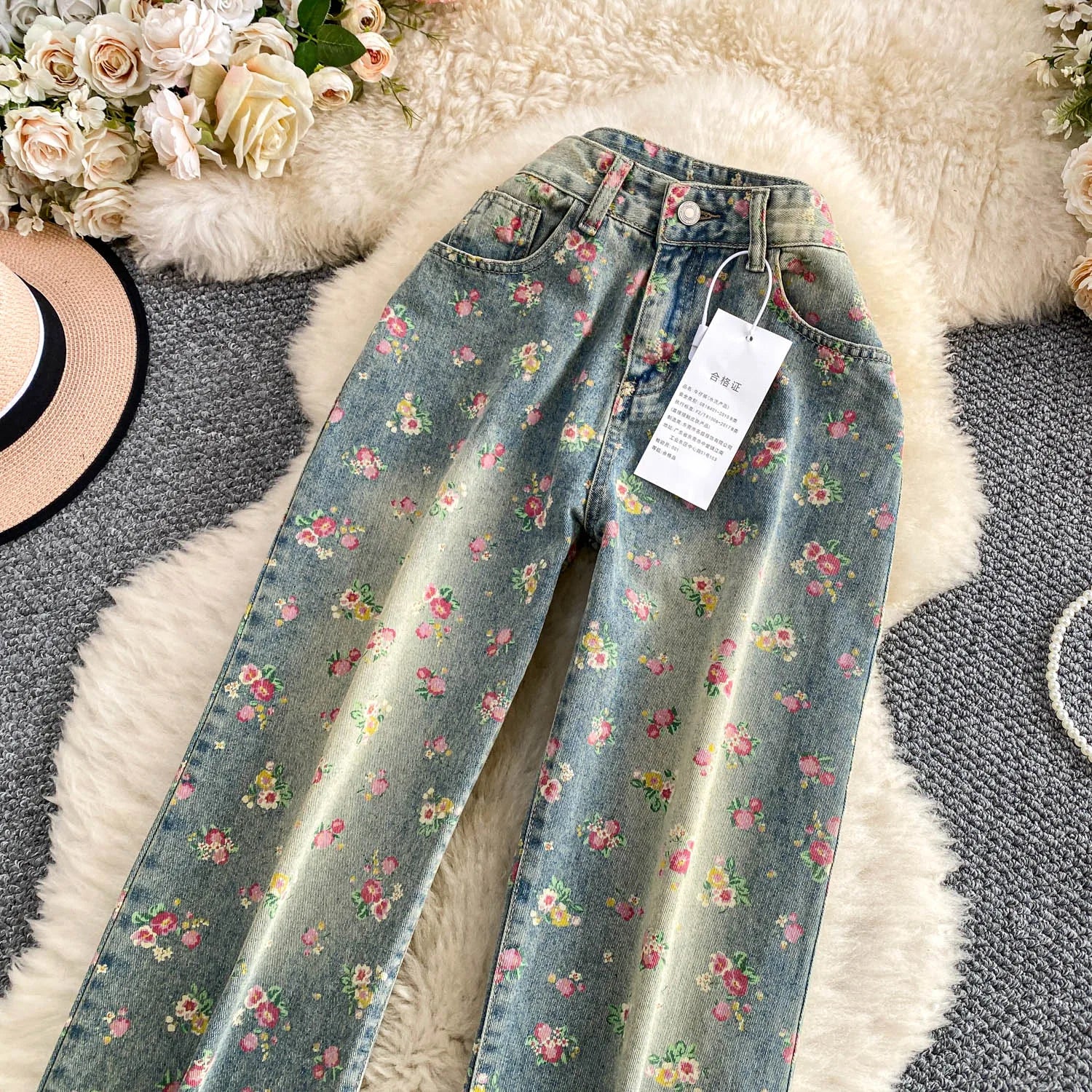 Women's Fashion Floral Print Denim Pants Colorful Flower Wide Leg Trousers Female Spring Autumn Versatile High Waist Blue Jeans
