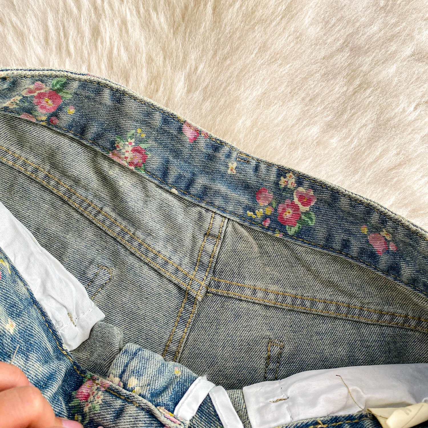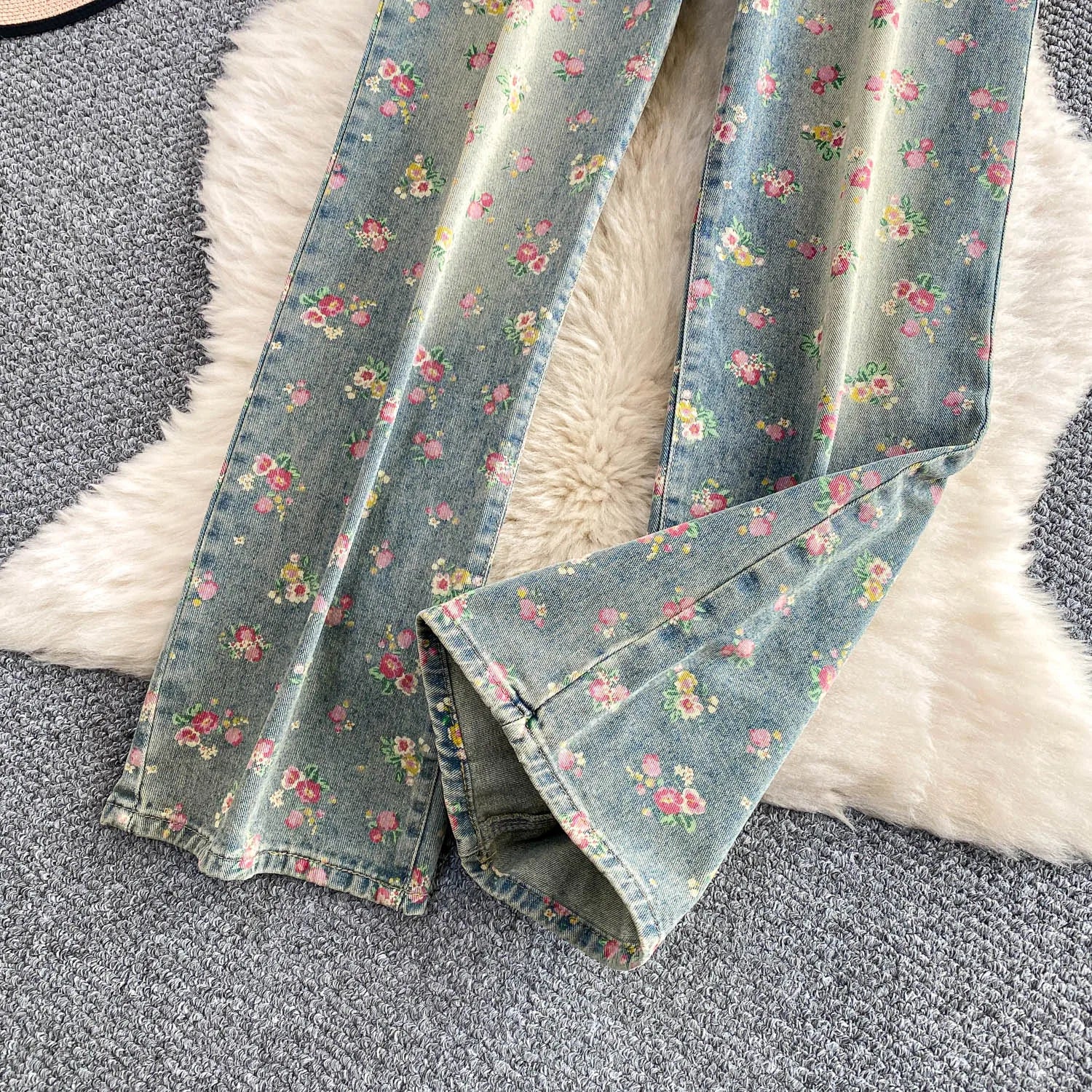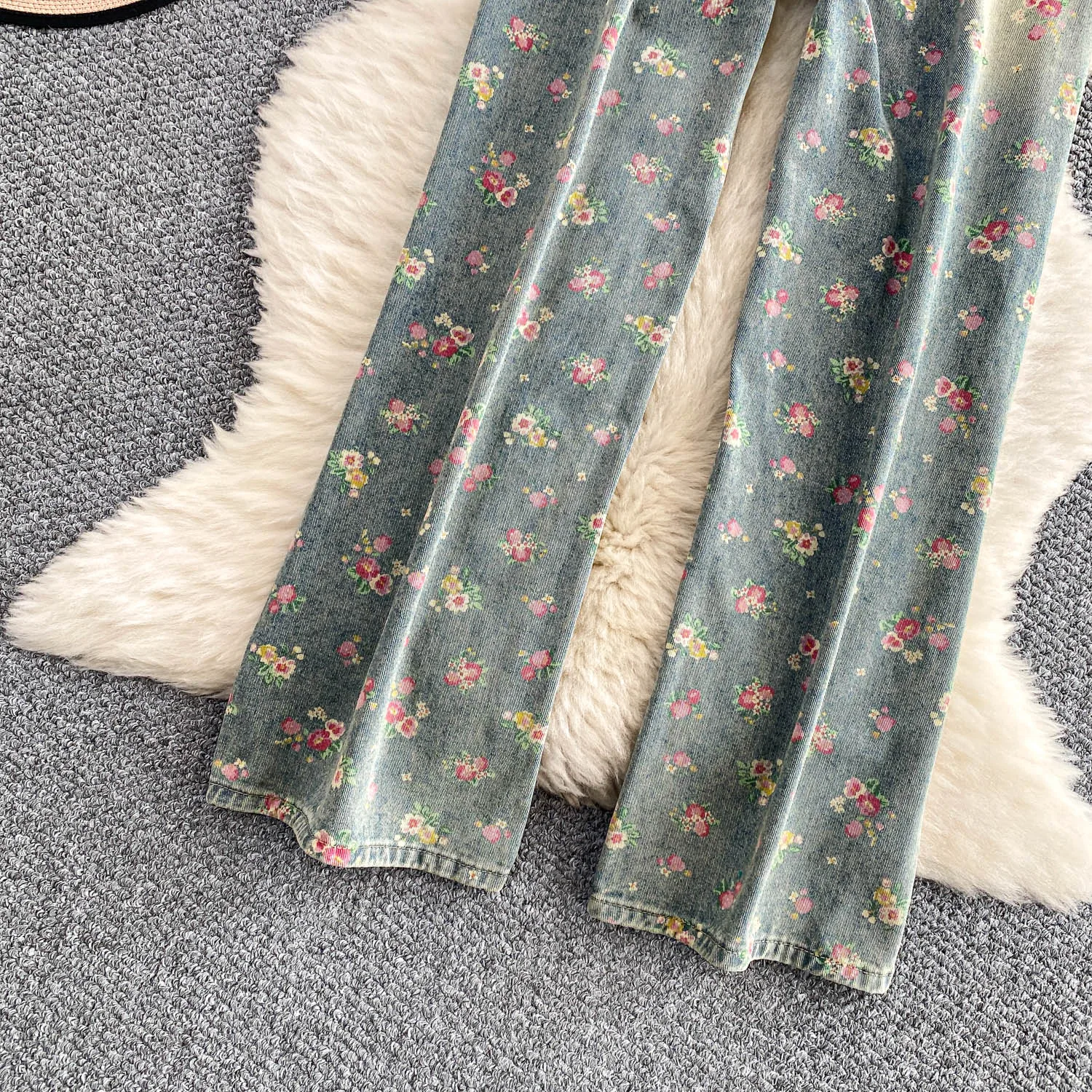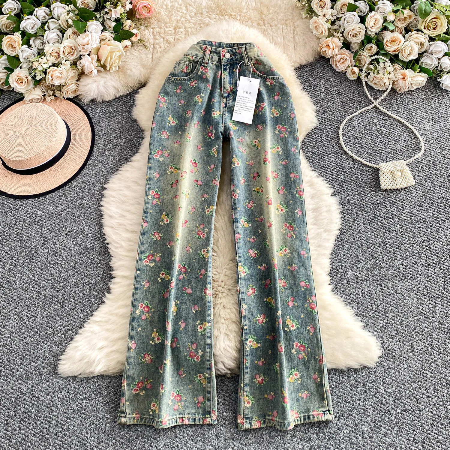 Women's Fashion Floral Print Denim Pants Colorful Flower Wide Leg Trousers Female Spring Autumn Versatile High Waist Blue Jeans