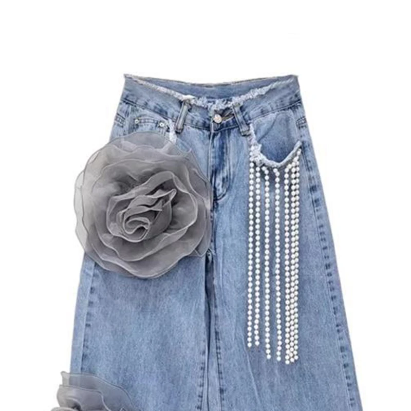 Women's High Waist Wide-Leg Casual Jeans Trousers Summer 2025 Loose Fit Joker Design Three-Dimensional Flower Wide-Leg Pants