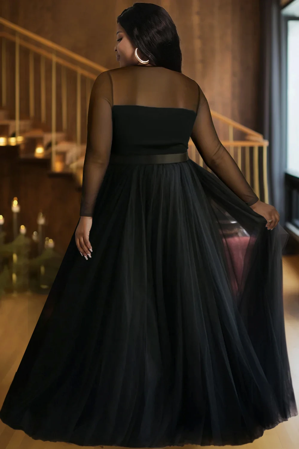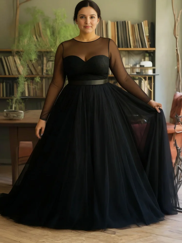 Women's Plus Size Mesh Evening Dress Long Sleeve See Through High Waist Pleated A-Line Elegant Wedding Guest Black Maxi Dresses