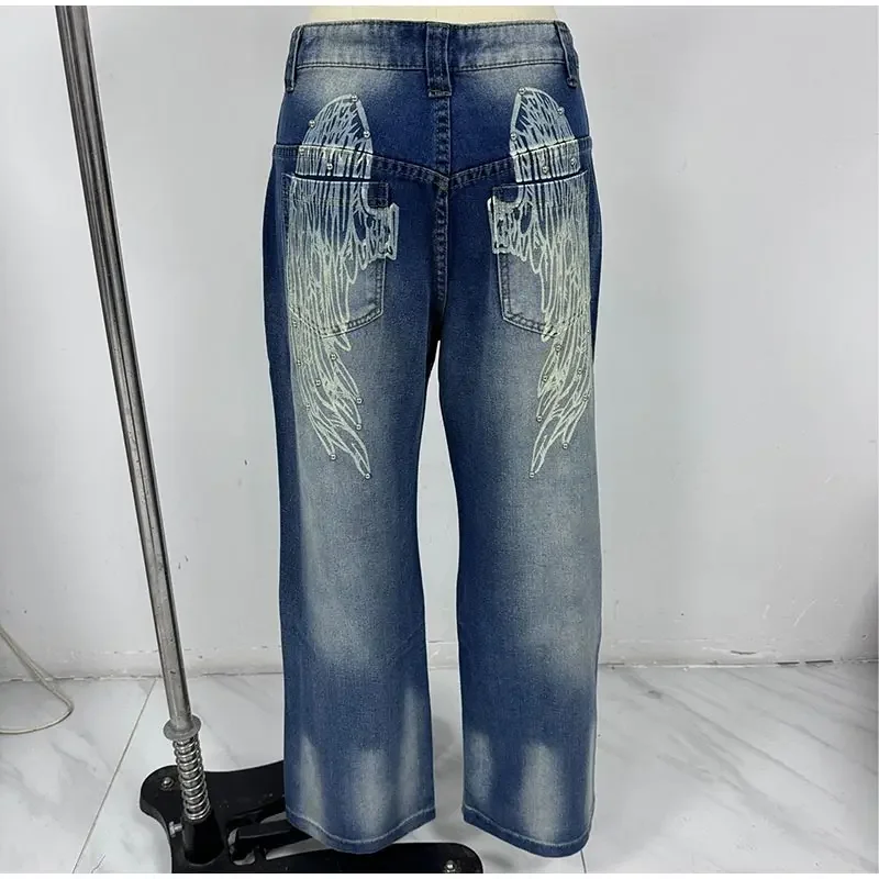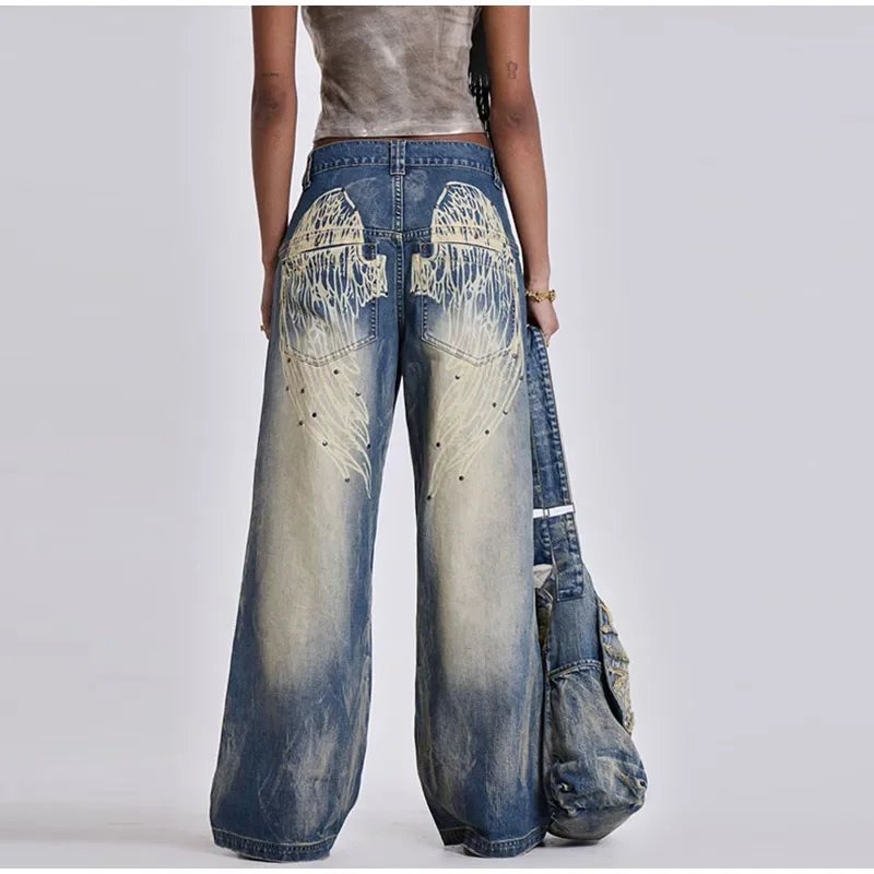 Women's Vintage Baggy Jeans High-Waisted Wide Leg Denim Pants with Back Wing Print Washed Y2K Streetwear 2025 Spring Summer Chic